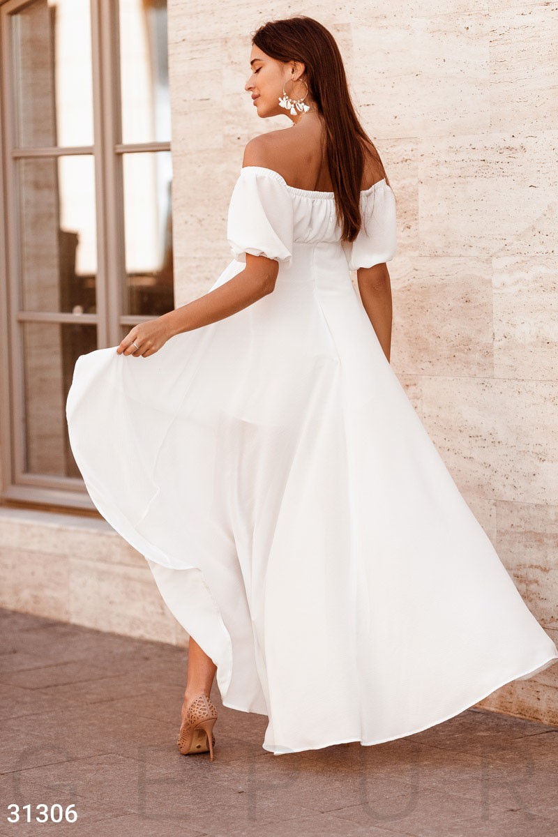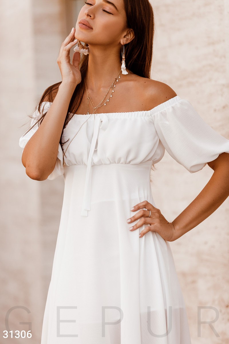 Невесомое асимметричное платье из легкой шифоновой ткани, созданное дизайнерами Gepur: вырез-лодочка на эластичной вставке для комфортной фиксации, короткий рукав-фонарик, завышенная линия талии и расклешенная юбка с удлиненной спинкой.