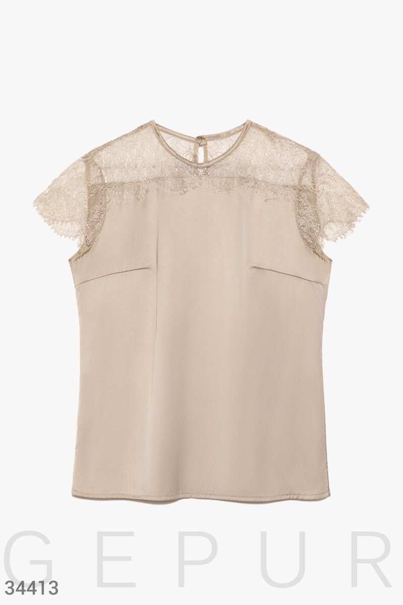 Шелковая блуза бежевого цвета: круглый вырез, сзади вырез-капелька с пуговицей, кокетка и рукава выполнены из утонченного французского кружева с цветочными мотивами.