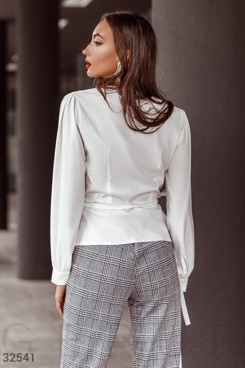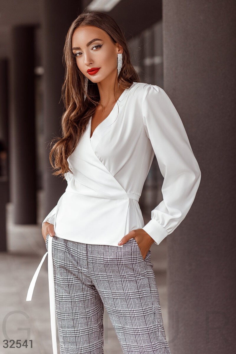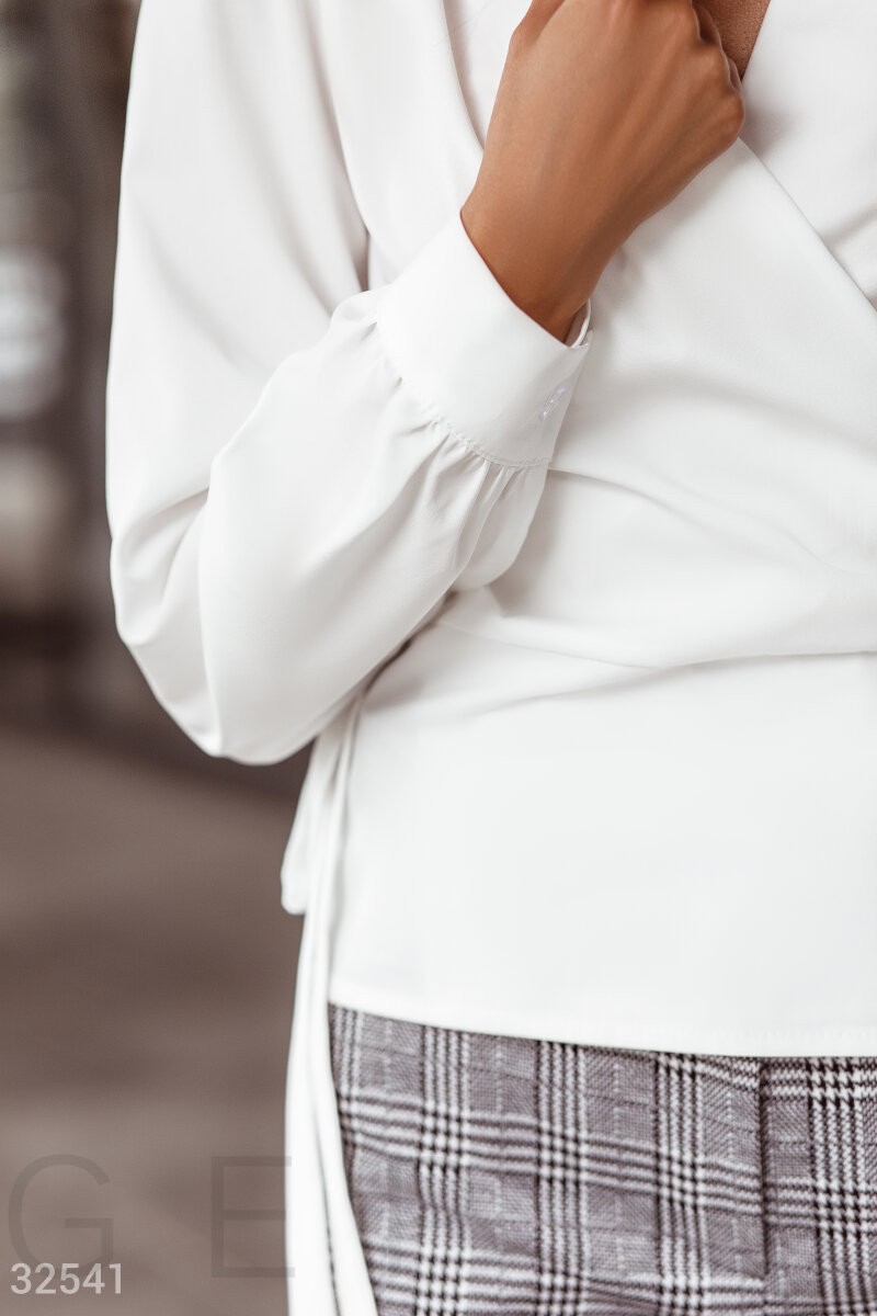 Блуза светло-молочного оттенка на запа́х с глубоким v-образным вырезом, небольшими защипами на плечах и длинным рукавом на широкой манжете.