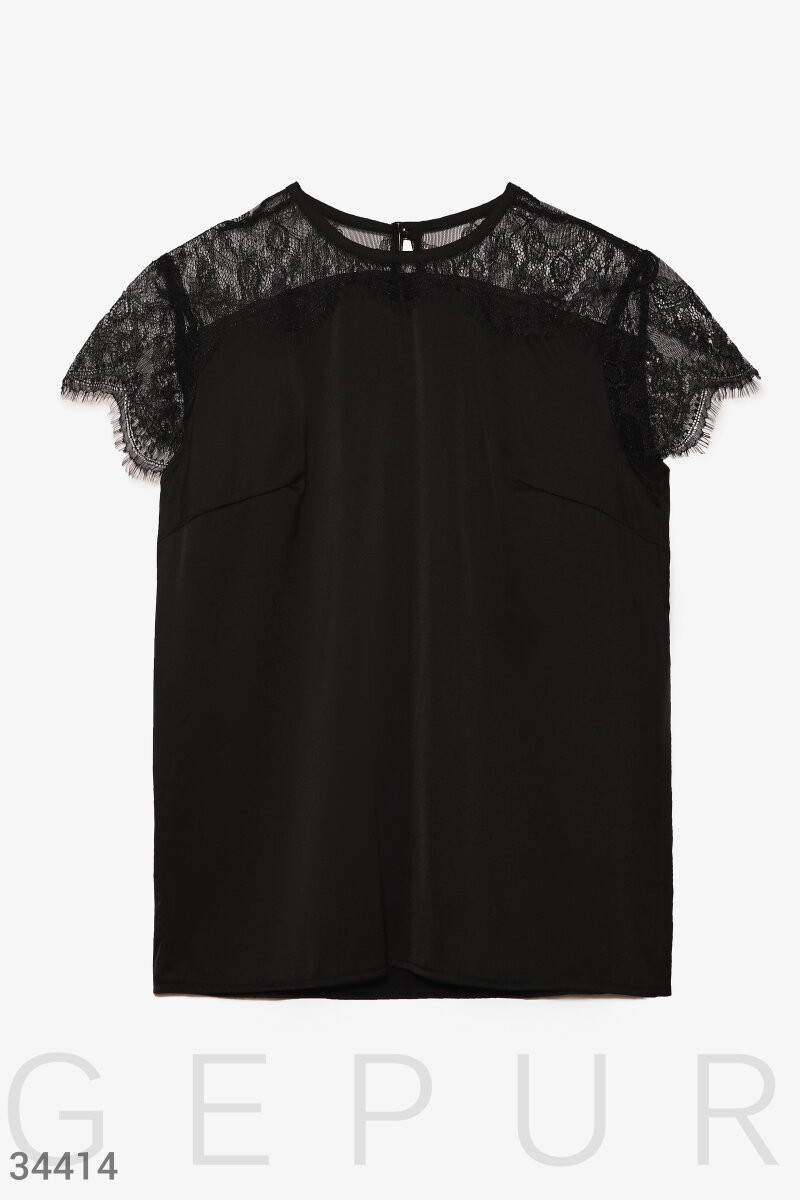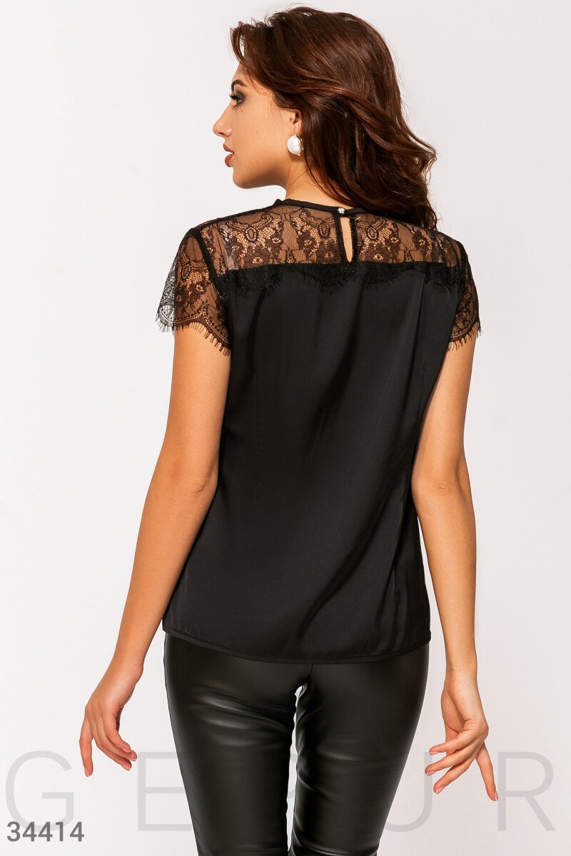 Шелковая блуза черного цвета: круглый вырез, сзади вырез-капелька с пуговицей, кокетка и рукава выполнены из утонченного французского кружева с цветочными мотивами. Артикул: 34414 Цвет: черный Материал: шелк Армани Состав: полиэстер 97% спандекс 3%