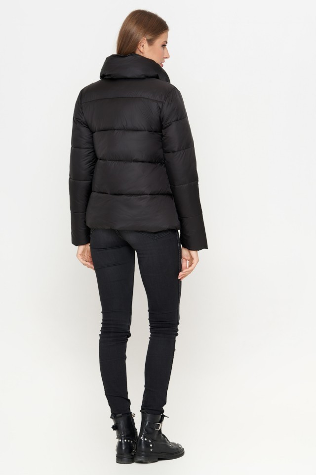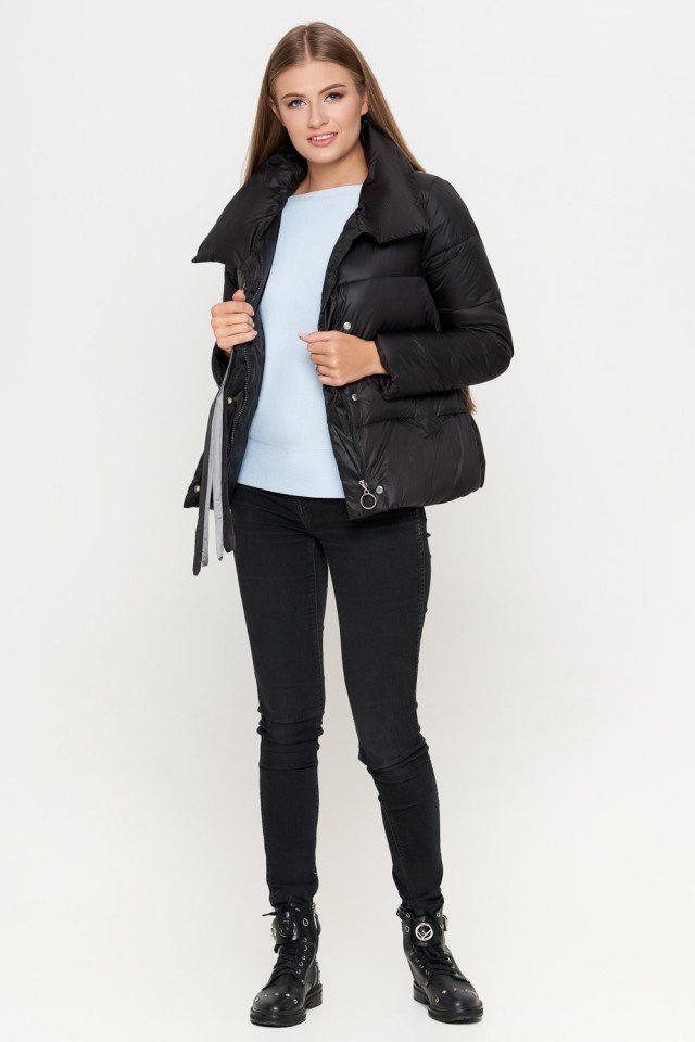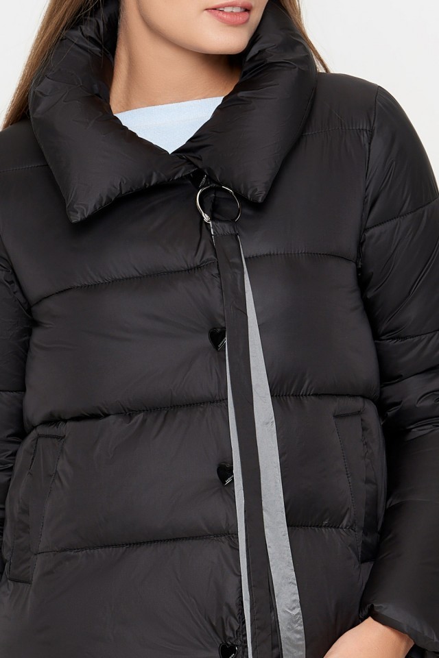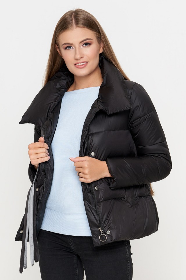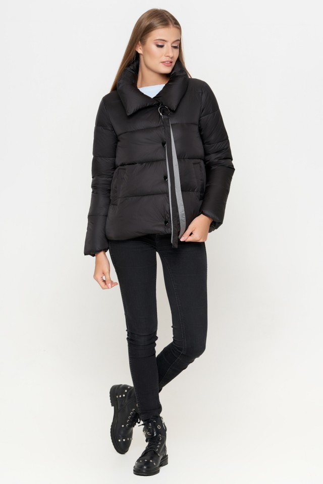 Черный молодежный женский пуховик осенне-весенний с ленточками модель 25282