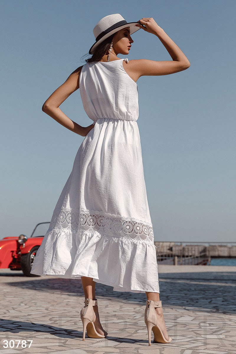 Длинный сарафан на тонких регулируемых бретелях, с глубоким круглым вырезом, эластичной вставкой на талии и расклешенной юбкой с кружевной вставкой.