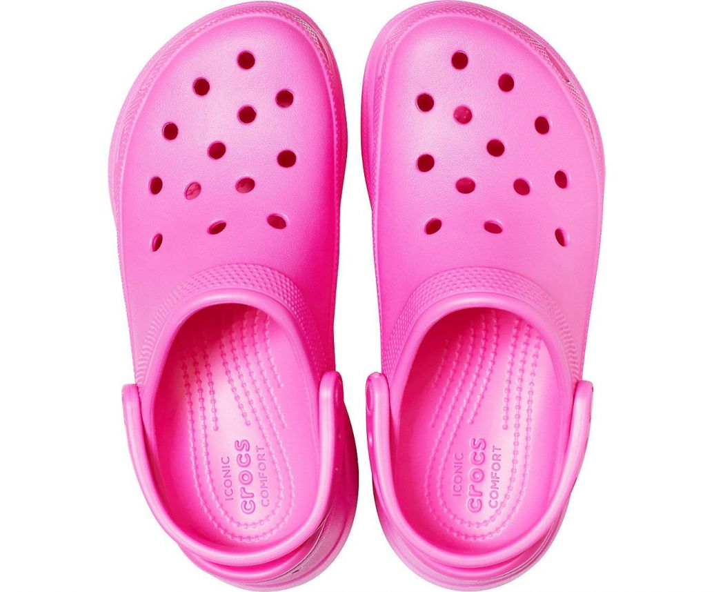 Оттенок Electric Pink — это насыщенный малиновый цвет, который моментально привлекает внимание и подчеркивает индивидуальность обладательницы. Особенностью модели является не только эффектная высота, но и дополнительная текстура Croslite™ вокруг пятки и носка, а также возможность персонализации с помощью значков Jibbitz™.