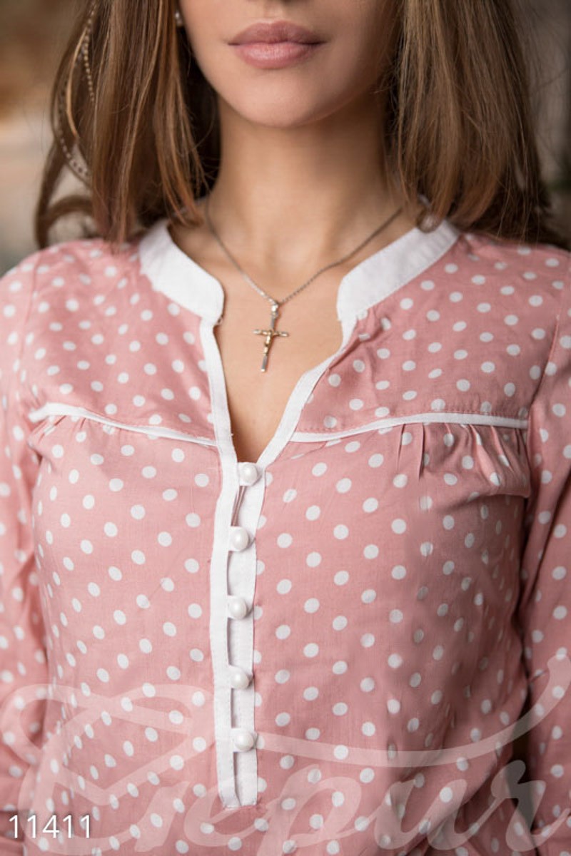 Легкая блуза свободного кроя, выполненная из хлопковой ткани в горошек: контрастный воротник с v-образным вырезом спереди, кокетка на пуговицах, рукав ¾ и подол, дополненные эластичной вставкой.