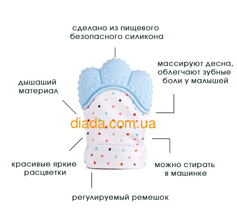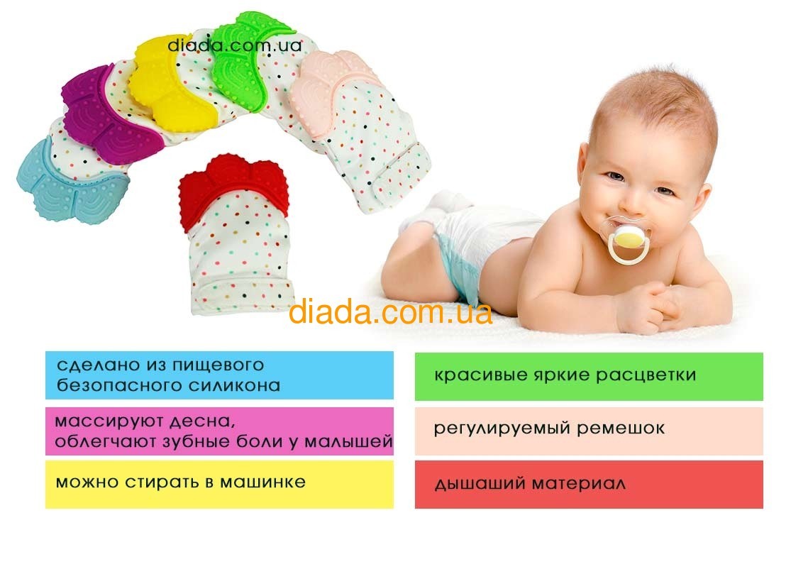 Перчатка грызунок прорезыватель, выполнена из пищевого силикона. Прекрасное решение для малышей. Она легко стирается, в ней ручка не потеет, немного шелестит и забавляет ребенка. Когда малыши ее грызут, то не травмируют свои пальчики, перчатка не намокает, это абсолютно безопасно для детей! Детки массируют десна, и легче переносят зубные боли при прорезывании зубов!