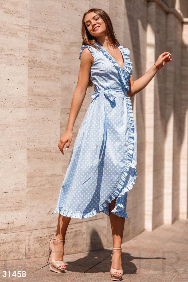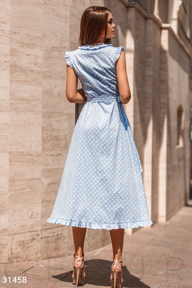 Удлиненное платье на запа́х в контрастный мелкий горошек: глубокий v-образный вырез, аккуратные рукава-крылышки и утонченные оборки по всей длине платья.