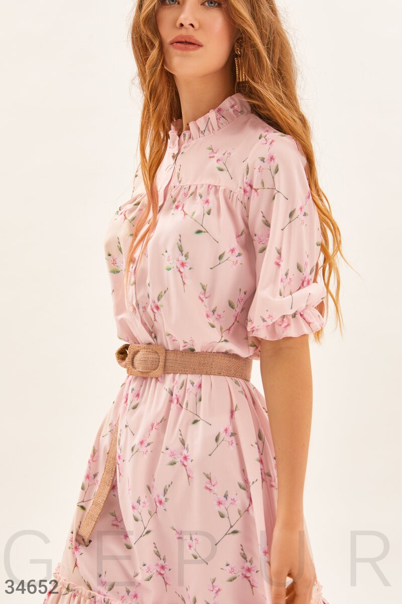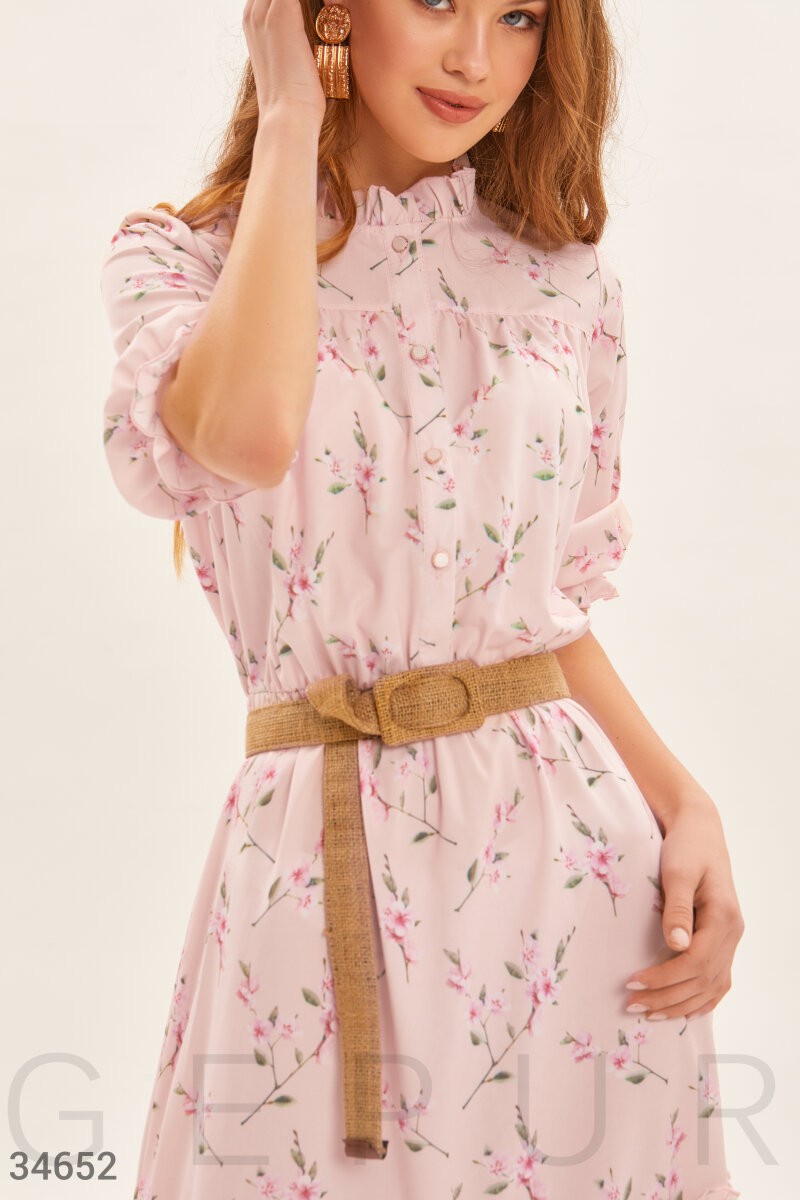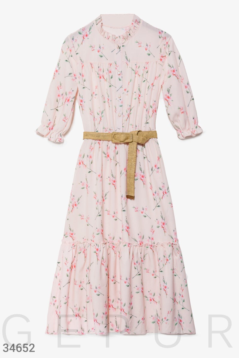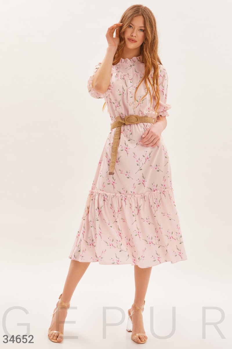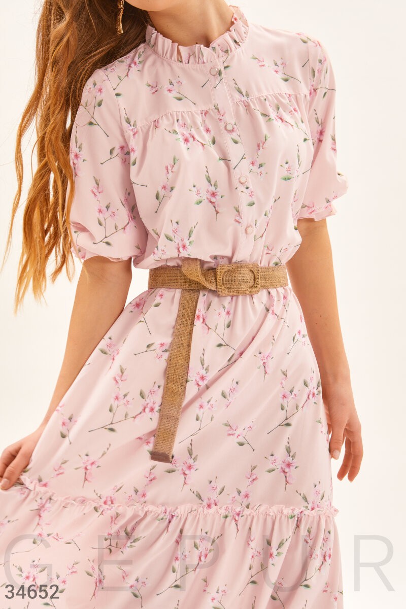 Элегантное платье-миди в романтичный цветочный принт. Круглый вырез с изящными рюшами. Планка с пуговицами спереди. Объемный рукав ¾ с эластичной вставкой. Отрезная талия с эластичной вставкой, и расклешенная юбка с воланом, дополненная плетеным поясом.