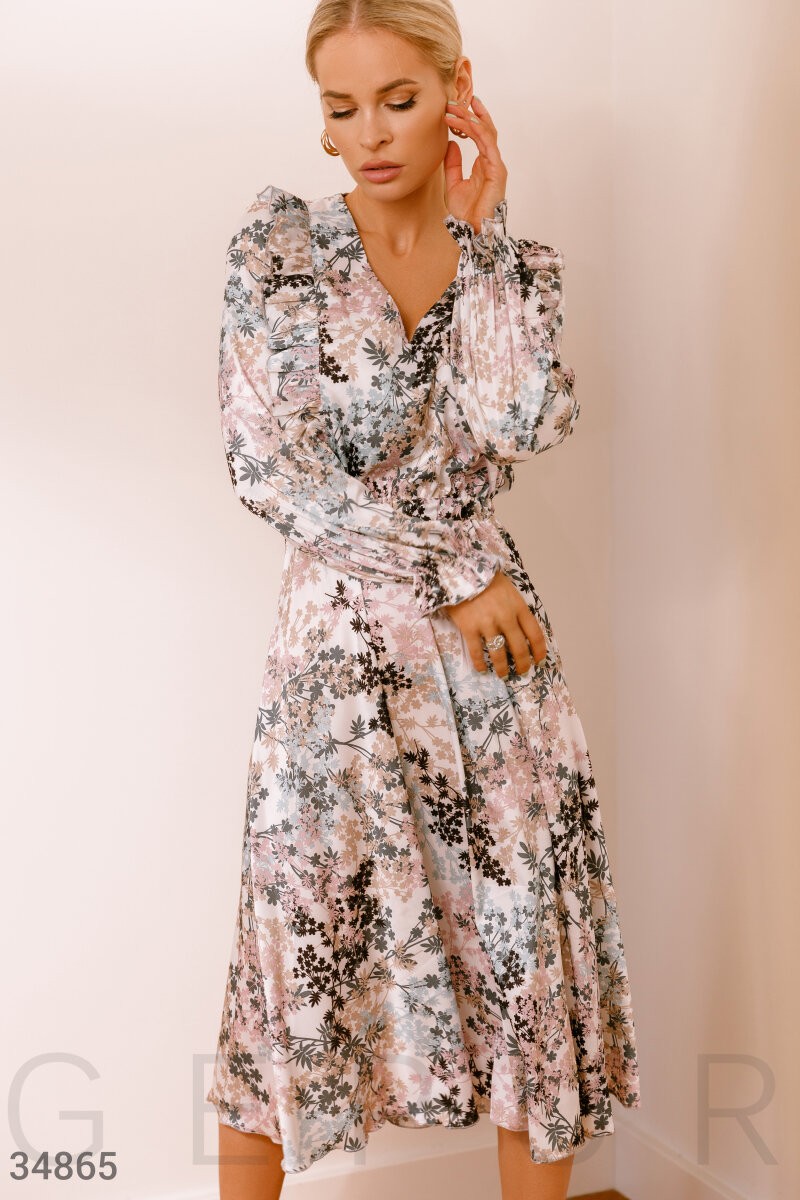 Утонченное платье из искусственного шелка, декорированное цветочной россыпью. Глубокий v-образный вырез, длинный объемный рукав с эластичной манжетой. Романтичные рюши на груди. Отрезная талия с эластичной вставкой. Расклешенная юбка в легкую складку. Артикул: 34865 Цвет: серо-розовый Материал: шелк Армани Состав: полиэстер 97% спандекс 3%