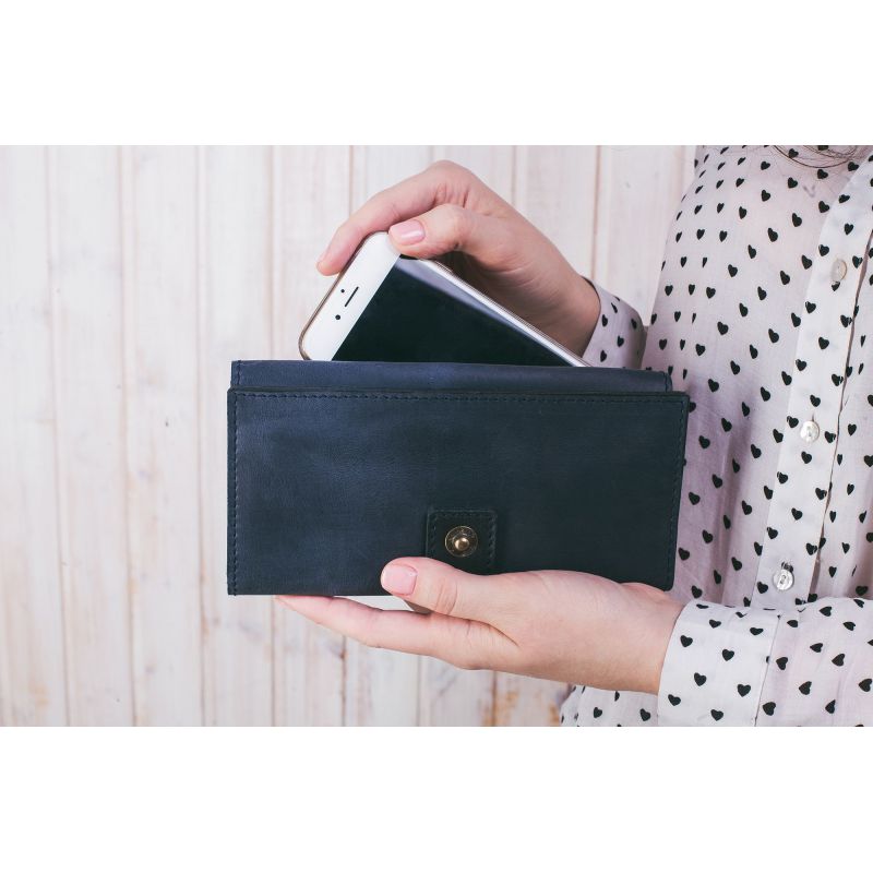 Уникальная по удобству и функциональности модель - совмещающая в себе портмоне, кошелек и мини-клатч! Предусмотрено место для карточек, небольших мелочей, купюр, монет и мобильного телефона. Подходит для любых купюр, в том числе - для евро и долларов. Сделано полностью вручную в нашей мастерской в Киеве. Гарантия на портмоне - 3 года с момента покупки. ВНИМАНИЕ! Выделка данной кожи предполагает естественное появление на ней царапин и потертостей в ходе использования! От этого изделие становится более индивидуальным и приятным, это оценят настоящие поклонники винтажного стиля:)  А так же первое время кожа может краситься при сильном трении об другие предметы  - это особенность её выделки, постепенно этот эффект уменьшается,  кожа полируется и приобретает чуть глянцевый эффект. Фурнитура и комплектация может быть изменена производителем