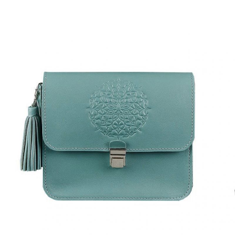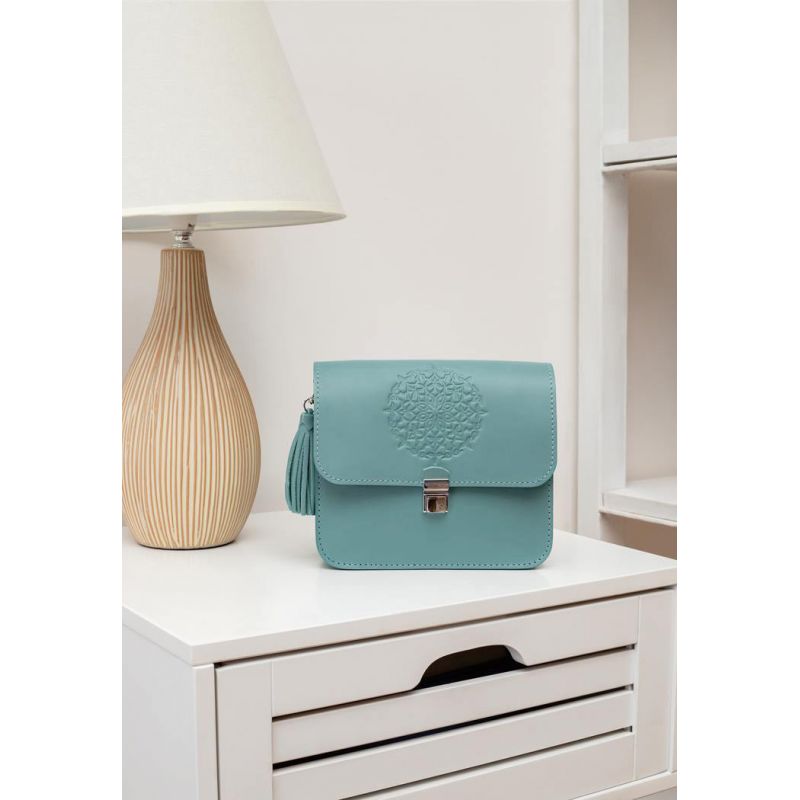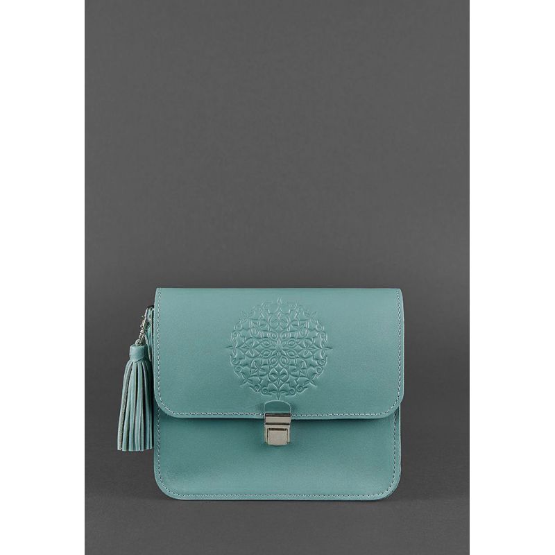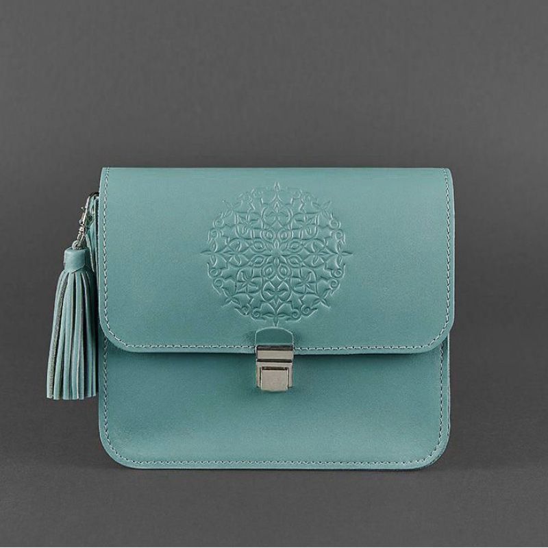 Длину кожаного плечевого ремешка можно легко регулировать. Украшена бирюзовая сумка BlankNote Лилу съемной кисточкой, которая может использоваться как брелок. На передней части женской сумки расположено тиснение в виде индийской мандалы. Закрывается кожаная сумка на стильный портфельный замочек