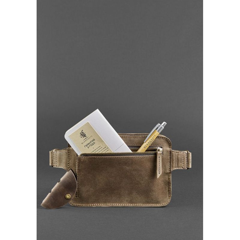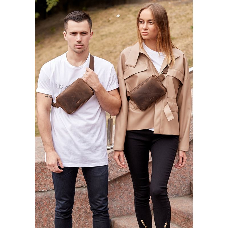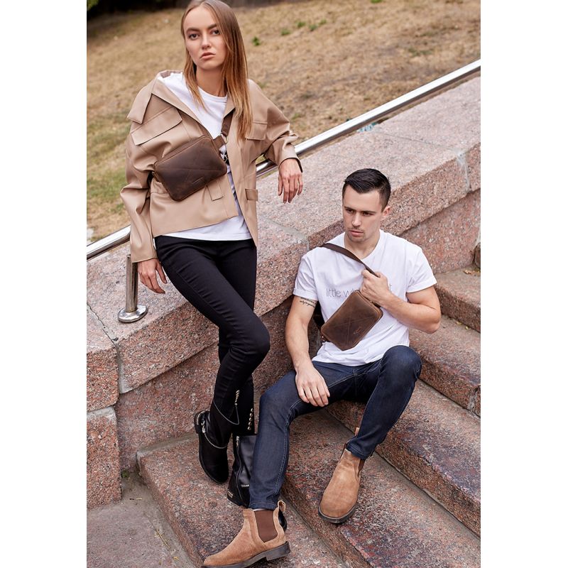 Поясная сумка DropBag minі - это удобная и простая вещь на каждый день. Лаконичная и функциональная модель для любого случая. Небольшую сумку будет удобно носить на поясе, бедрах или на груди при помощи очень удобного регулируемого ремня. Длину ремня можно регулировать от 80 до 110 см (индивидуальный размер ремня можно изготовить под заказ). Такие аксессуары очень популярны сейчас, благодаря своей универсальности и практичности. Ведь с такой сумкой все необходимое всегда будет под рукой и не нужно переживать за сохранность вещей. Выполнена сумка вручную из качественной и достаточно плотной натуральной кожи. Основное отделение на металлической застежке-молнии отлично подойдет для Вашего гаджета, паспорта и кошелька. Также внутри имеется отделение для мелочей и несколько маленьких кармашков для карточек. На задней стенке расположен вместительный карман, который закрывается на металлическую молнию. Также есть возможность заказать сумку с хольнитенами на верхней крышке. Для этого просто напишите  в примечаниях в заказе, или скажите менеджеру по телефону. Внутри, как всегда, есть несколько приятных подарков: кожаный холдер для наушников коричневого цвета; мини-тетрадка для записи Ваших интересных идей фирменная крафт-ручка. Сумка упакована в крафтовую коробку. Гарантия на изделие 3 года с момента покупки. ВНИМАНИЕ! Выделка данной кожи предполагает естественное появление на ней царапин и потертостей в ходе использования! От этого изделие становится более индивидуальным и приятным, это оценят настоящие поклонники винтажного стиля:)  А так же первое время кожа может краситься при сильном трении об другие предметы  - это особенность её выделки, постепенно этот эффект уменьшается,  кожа полируется и приобретает чуть глянцевый эффект. Фурнитура и комплектация может быть изменена производителем