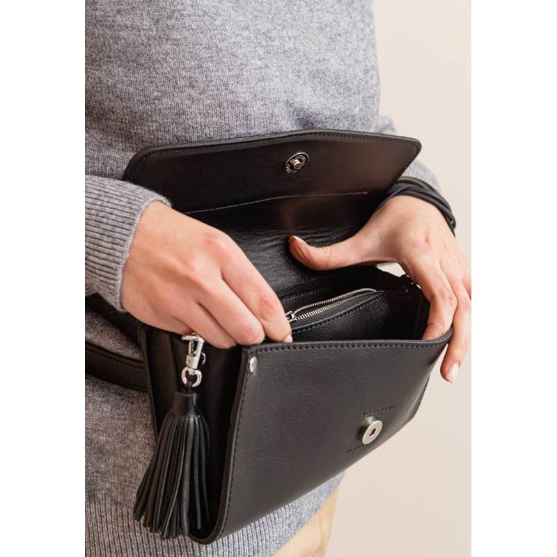 Внутри сумки два отделения, в которые поместиться телефон, кошелек, ключи и другие важные вещи небольшого размера. Также есть отделение на молнии и несколько мелких карманов для пластиковых карточек и визиток. Закрывается сумочка навесным клапаном на магнитную кнопку.