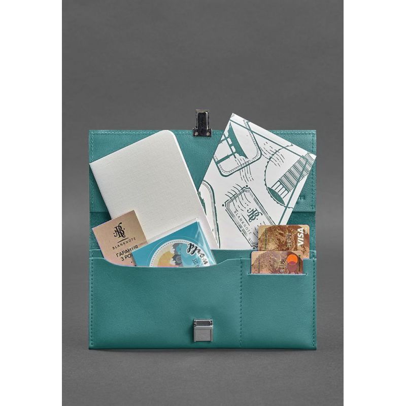 Линейка «Тиффани» – это ласковый танец солнечных зайчиков, бесконечная свежесть утреннего бриза, нежный шепот волн на Лазурном берегу. Это больше, чем просто бирюзовые аксессуары, – это ощущение блаженной беззаботности и утонченной роскоши. Изысканный лазурно-голубой оттенок стал знаменитым на весь мир, когда ювелирная компания Tiffany & Co. выбрала его своим фирменным цветом. С тех пор он ассоциируется с элегантностью, женственностью и благополучием. Для новой линейки мы использовали краст. Краст (от англ. crust – «кора») – это натуральная кожа средней толщины, с умеренным блеском и едва заметным естественным рисунком на поверхности. Так что пусть вас не смущает внешняя мягкость – аксессуары «Тиффани» созданы на годы. Но самое главное, каждый раз, держа в руках какой-то предмет из этой коллекции, вас будет наполнять легкость, романтичность и вдохновленность. Как это объяснить? Не знаем. Просто вот такая она, магия ручной работы и оттенка «Тиффани» Тревел-кейс 2.0 линейка Тиффани Едете в долгожданный отпуск? Предлагаем взять с собой надежного хранителя Ваших билетов и документов :) Это холдер для документов удобного размера, в котором поместятся посадочные талоны (или железнодорожные билеты), паспорта, деньги, небольшой блокнотик, телефон и масса других полезных вещей, которые должны быть всегда под рукой в путешествии. Холдер сделан полностью вручную из плотной натуральной кожи.  Внутри - несколько отделений: для билетов, паспорта, пластиковых карт, денег, визиток. Закрывается холдер на удобный и стильный портфельный замок.  Содержание подарков внутри тревел-кейса может незначительно отличаться от того что на фото. Приятной Вам поездки! Гарантия на тревел-кейс - 3 года с момента покупки. Фурнитура и комплектация может быть изменена производителем
