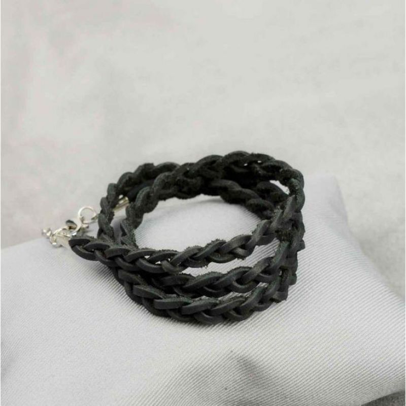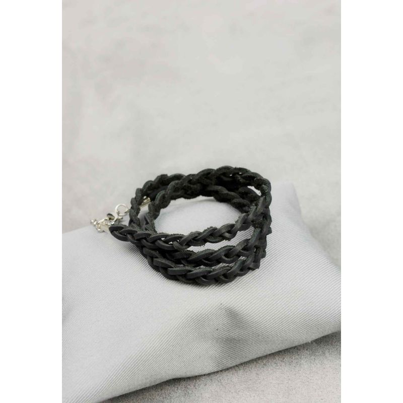Женский кожаный браслет тонкая косичка черный