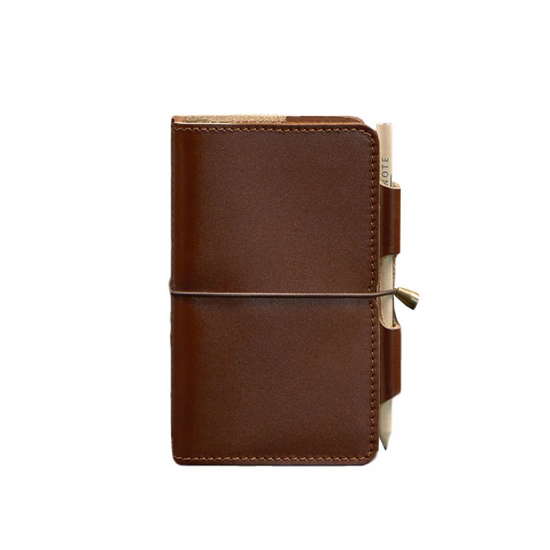 Этот блокнот исполнен в интересном форм-факторе: не классический книжный переплет, а так называемый "софт-бук", т.е. прикрепленные к цельному куску кожи несколько тетрадей. В качестве обложки - натуральная кожа коричневого цвета. Внутри - классический блокнот, разделенный на три съемные тетради. Тетради крепятся внутри обложки при помощи резинки и при необходимости с легкостью заменяются на новые.