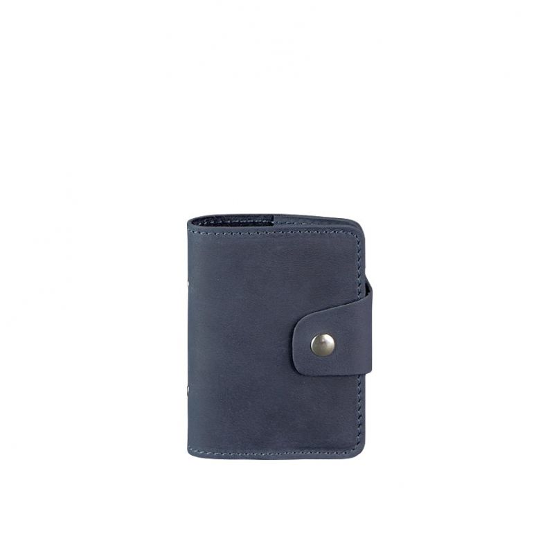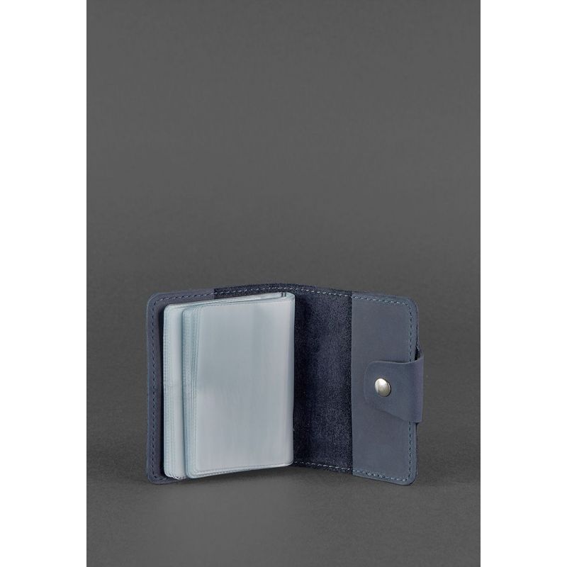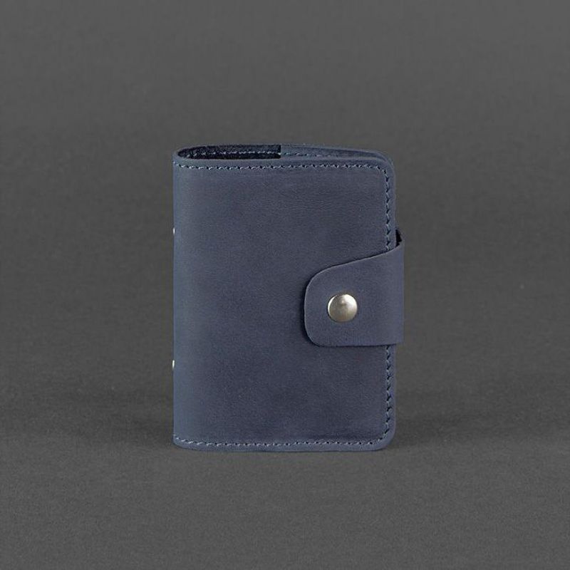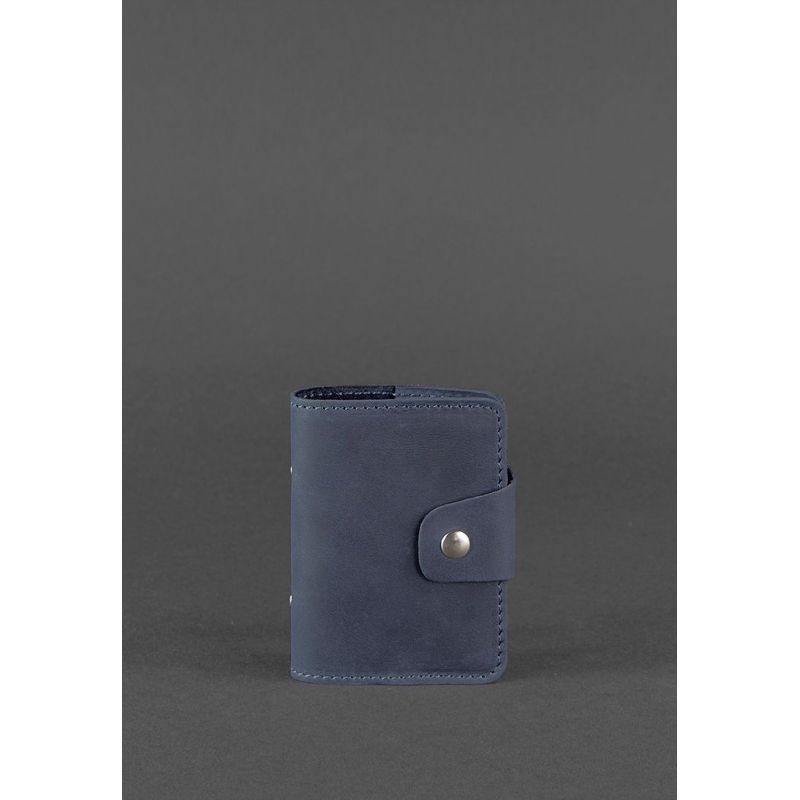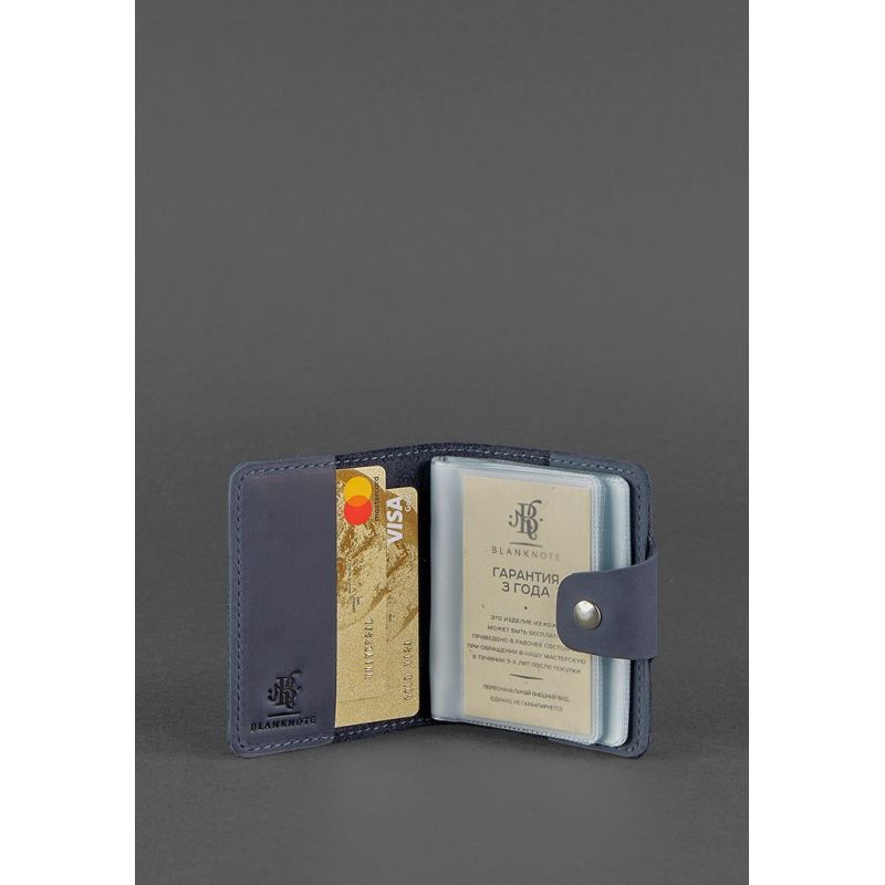 Кожаный кард-кейс для хранения банковских карточек и визиток. Выполнен аксессуар в виде книжечки с кожаной обложкой и прозрачными страничками.Он очень удобен в использовании - пролистали и быстро нашли нужную страничку, не нужно пересматривать все карточки. Имеется 20 прозрачных отделений и 2 кармана на обложке кард-кейса. Закрывается аксессуар на прочную металлическую кнопку. Изготовлен из натуральной кожи в темно-синем цвете. Такой аксессуар прекрасно подойдет и для мужчины и для женщины. Отличный вариант подарка для человека, который ценит качественные и натуральные вещи. Гарантия на кард-кейс - 3 года с момента покупки. ВНИМАНИЕ! Выделка данной кожи предполагает естественное появление на ней царапин и потертостей в ходе использования! От этого изделие становится более индивидуальным и приятным, это оценят настоящие поклонники винтажного стиля:)  А так же первое время кожа может краситься при сильном трении об другие предметы  - это особенность её выделки, постепенно этот эффект уменьшается,  кожа полируется и приобретает чуть глянцевый эффект. Фурнитура и комплектация может быть изменена производителем