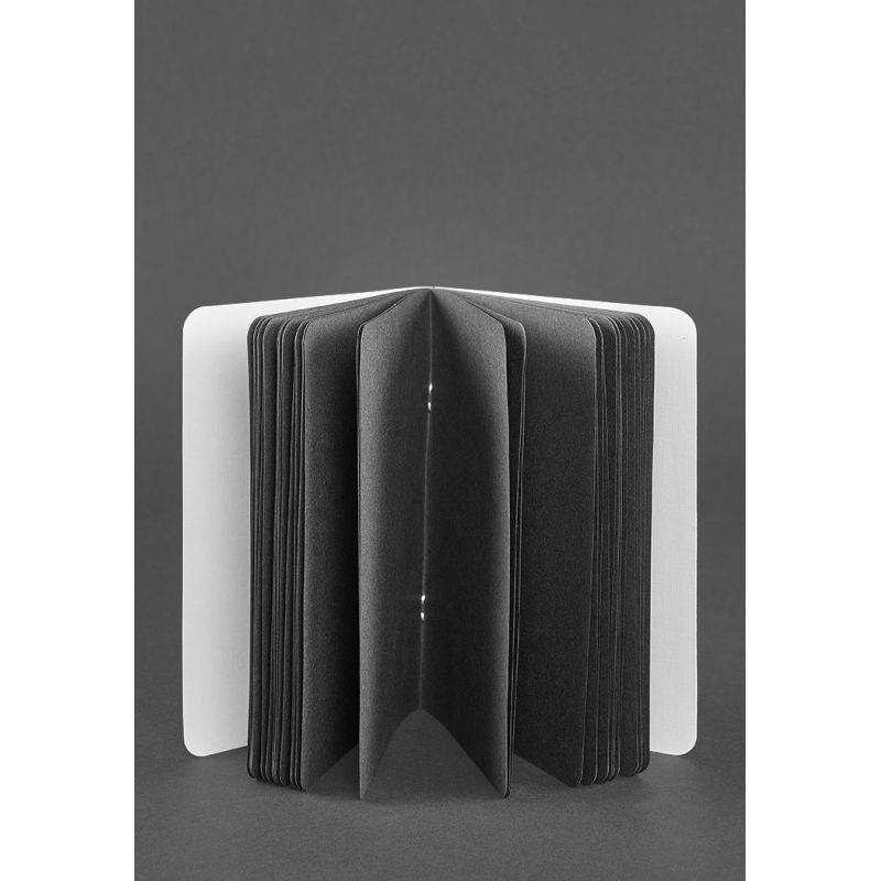 Дополняет и подчеркивает черный цвет страниц белоснежная обложка тетради, котора изготовлена из плотного дизайнерского картона. Контрастное цветовое сочетание в тандеме с оригинальной текстурой обложки выглядит изумительно.