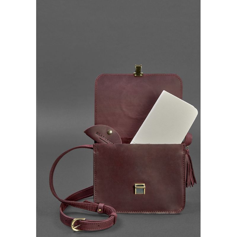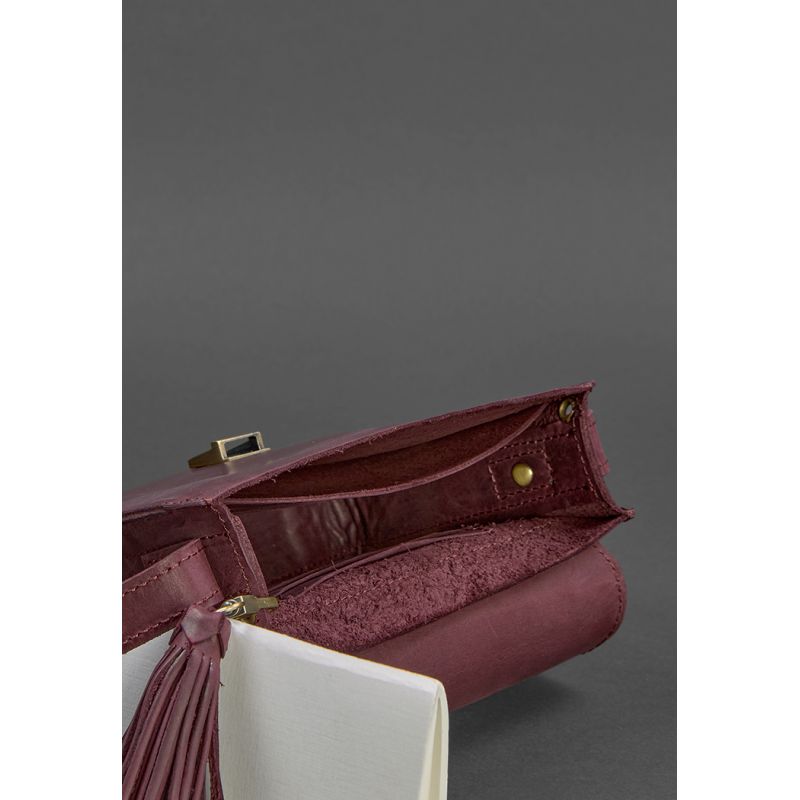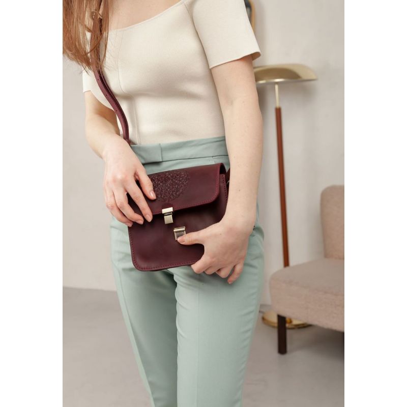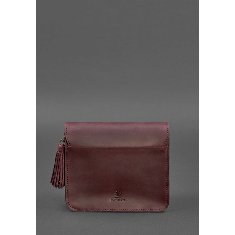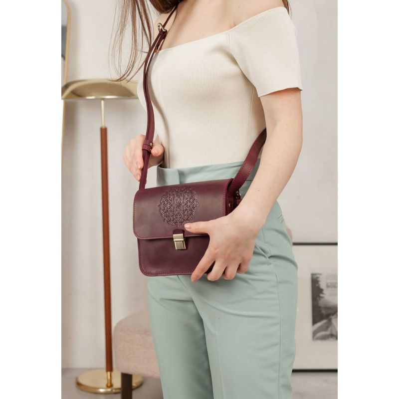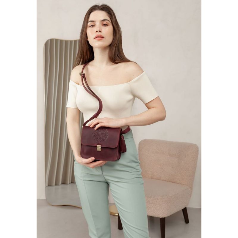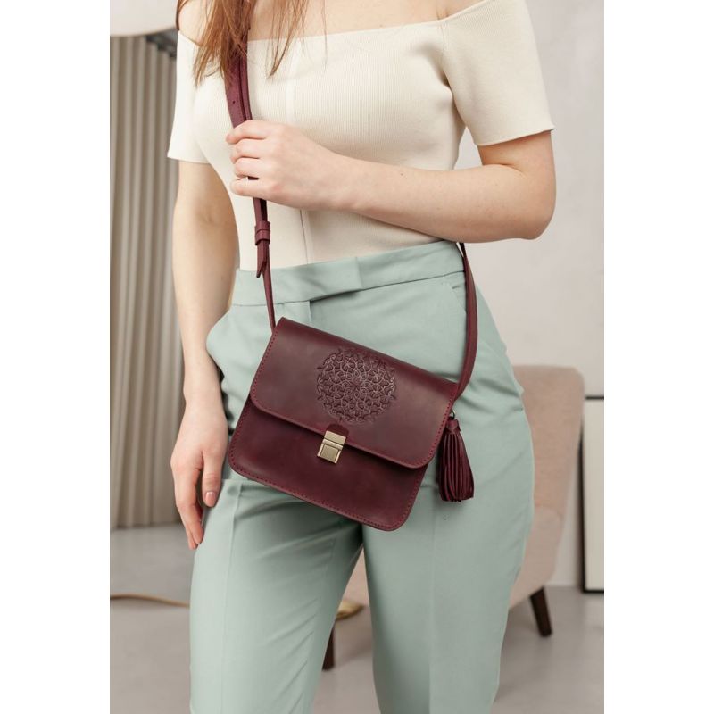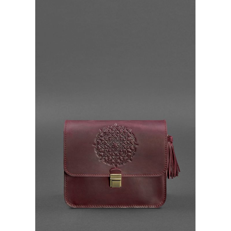 Украшена бордовая сумка BlankNote Лилу съемной кисточкой, которая может использоваться в качестве брелока. На передней части винтажной женской сумки расположено тиснение в виде индийской мандалы. Закрывается кожаная сумка на металлический портфельный замочек