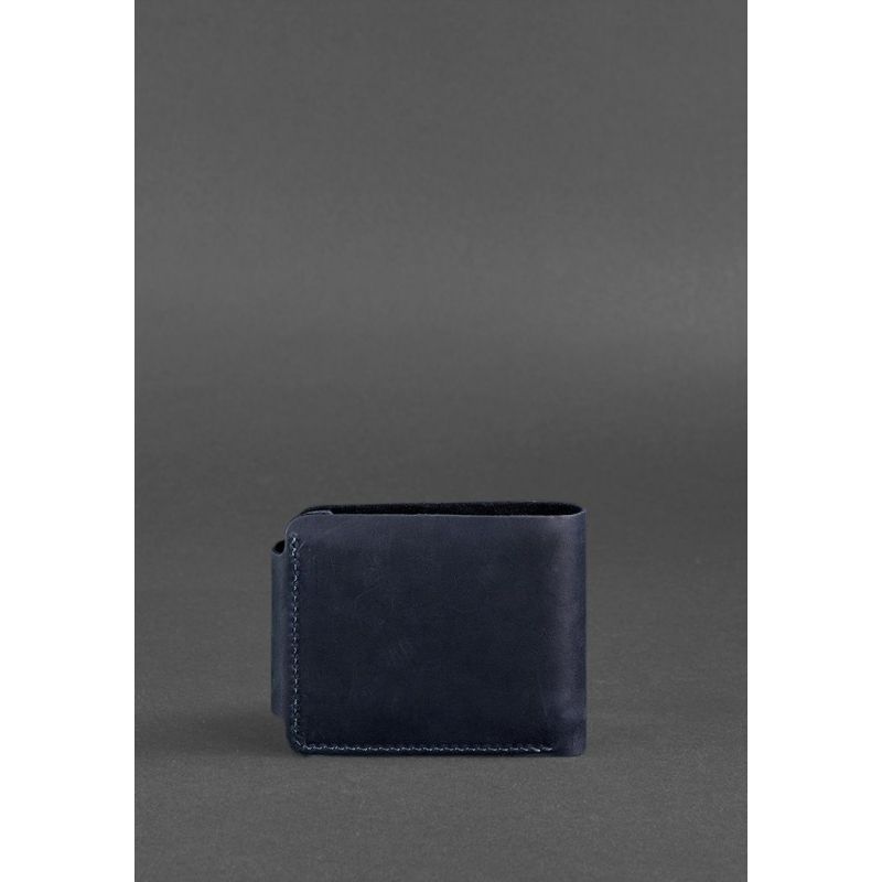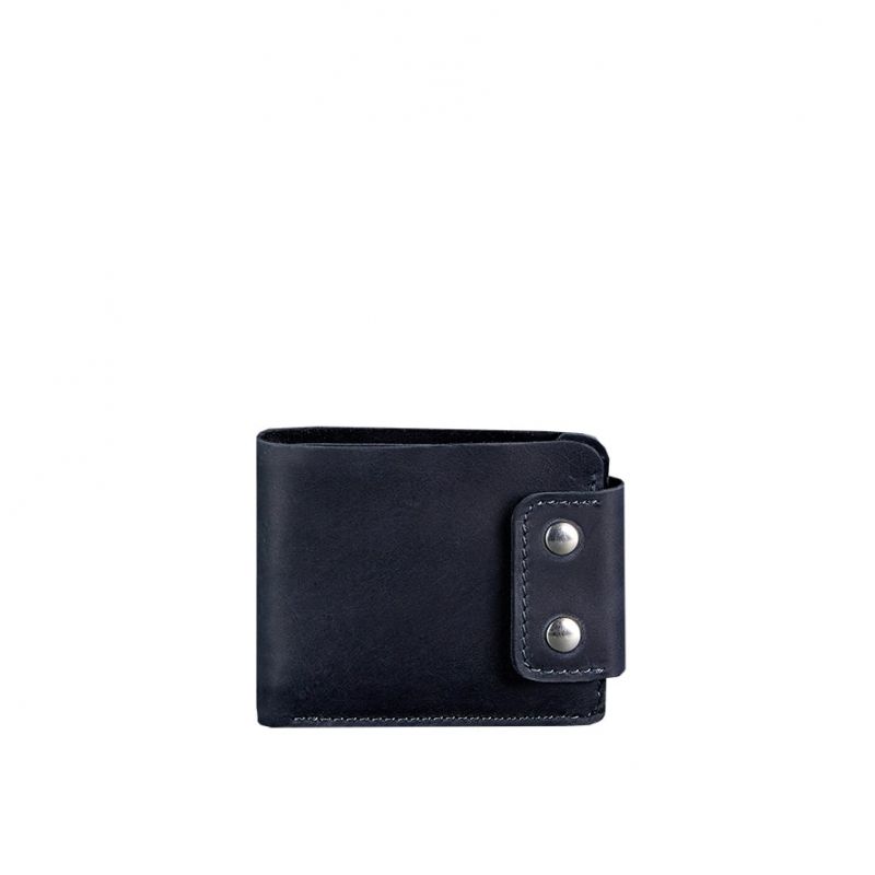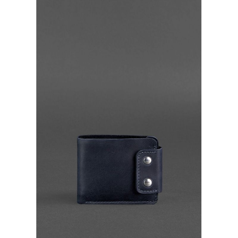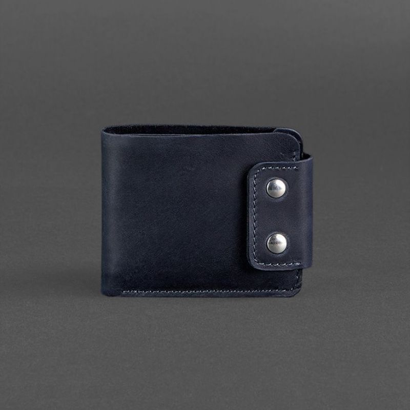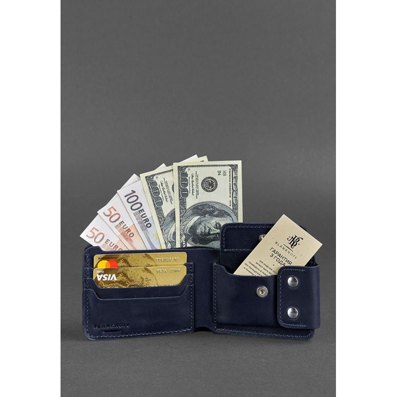 Стильное и практичное портмоне из натуральной кожи. Классическая модель с отделением для монет. Внутри два просторных отделения для купюр, что позволяет удобно распределить наличные. Дополнительно предусмотрено 4 отделения для кредитных карт и визиток. Портмоне надежно закрывается на кнопки. Подходит для любых купюр, в том числе - для евро и долларов. Для изготовления портмоне использовалась кожа Crazy Horse в темно-синем цвете. Сделано полностью вручную в нашей мастерской в Киеве. Гарантия на портмоне - 3 года с момента покупки. ВНИМАНИЕ! Выделка данной кожи предполагает естественное появление на ней царапин и потертостей в ходе использования! От этого изделие становится более индивидуальным и приятным, это оценят настоящие поклонники винтажного стиля:)  А так же первое время кожа может краситься при сильном трении об другие предметы  - это особенность её выделки, постепенно этот эффект уменьшается,  кожа полируется и приобретает чуть глянцевый эффект. Фурнитура и комплектация может быть изменена производителем