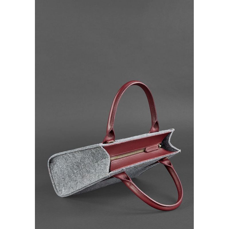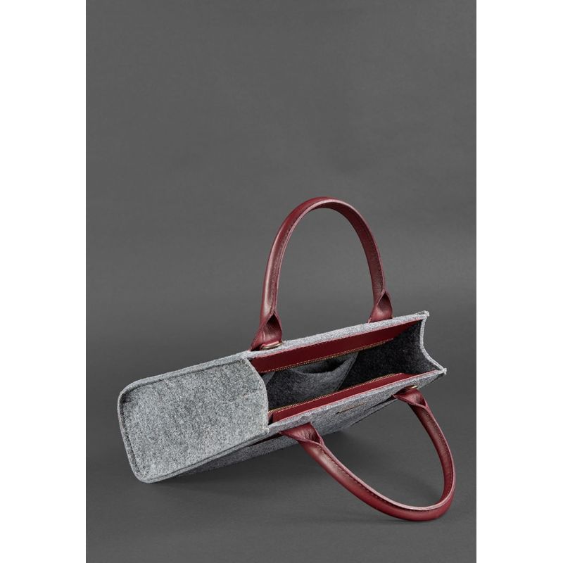 Текстуру и цвет фетра выгодно подчеркивает натуральная кожа в контрастном виноградном цвете, из которой изготовлены ручки и плечевой ремешок сумки. Кстати, ремешок можно легко отстегнуть и носить сумку в руке или на локотке – выбирать только вам.