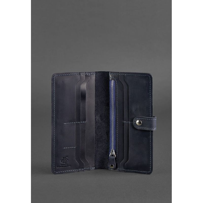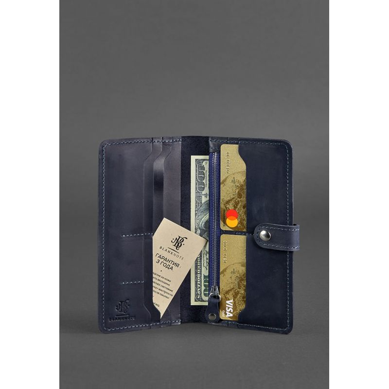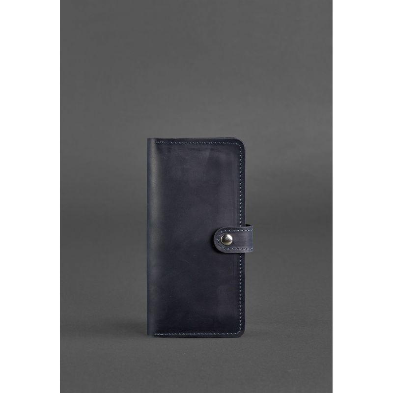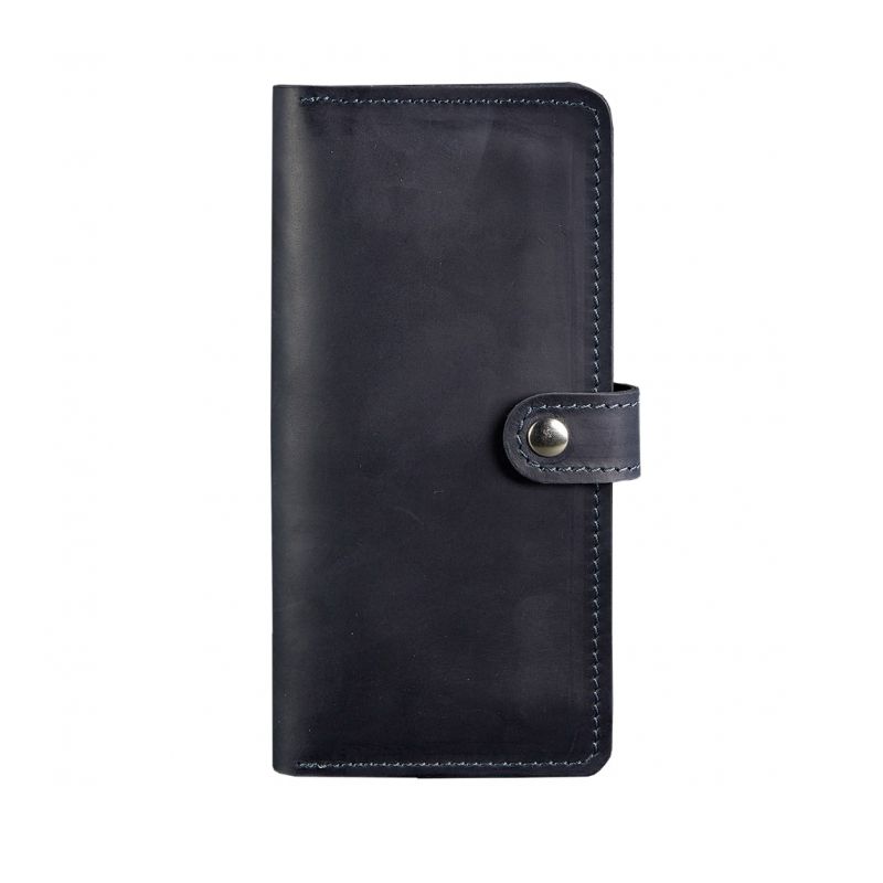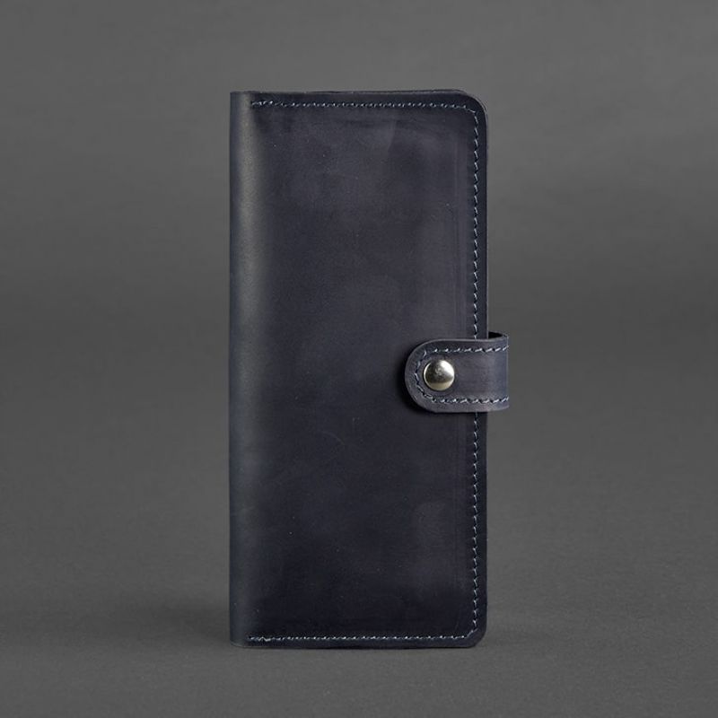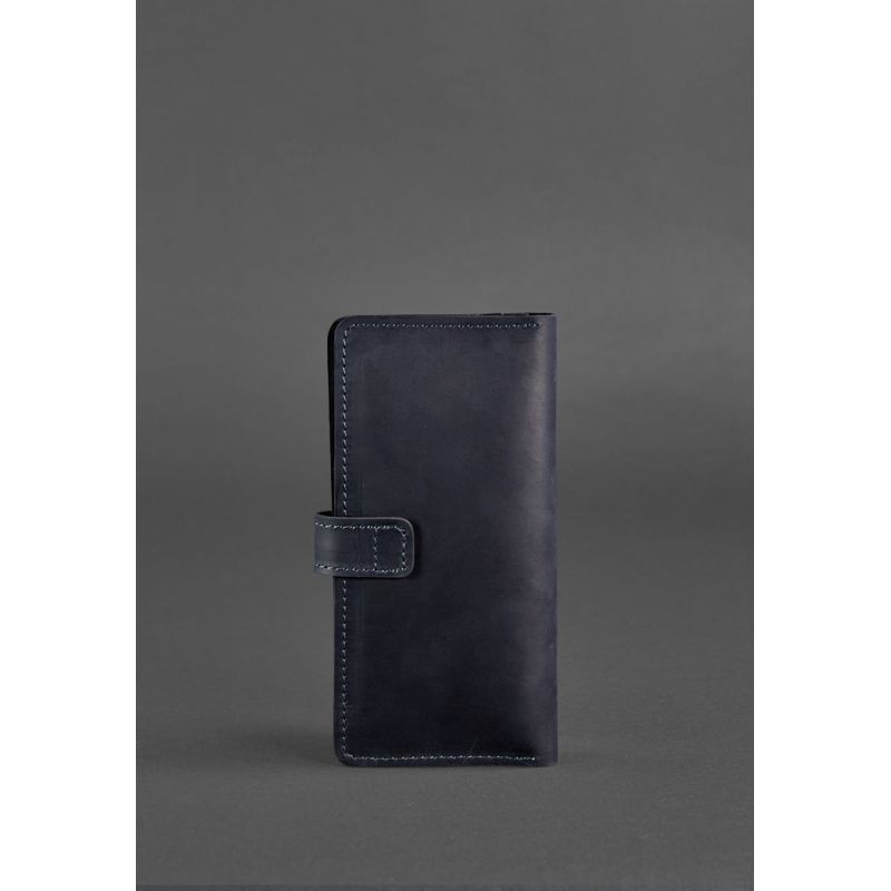 Классическое портмоне на кнопке, которое можно использовать как маленький клатч. Темно-синий цвет аксессуара в тандеме с винтажной натуральной кожей позволит легко сочетать портмоне, как с элегантным, так и с повседневным образом.