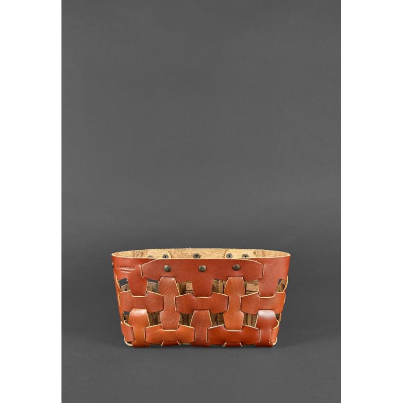 Состоит аксессуар из кожаной плетеной корзинки и внутренней текстильной сумки. Детали внешней корзинки выполнены из натуральной кожи Krast и скреплены по принципу пазлов. Для пошива внутренней сумки использовалась ткань Cordura.
