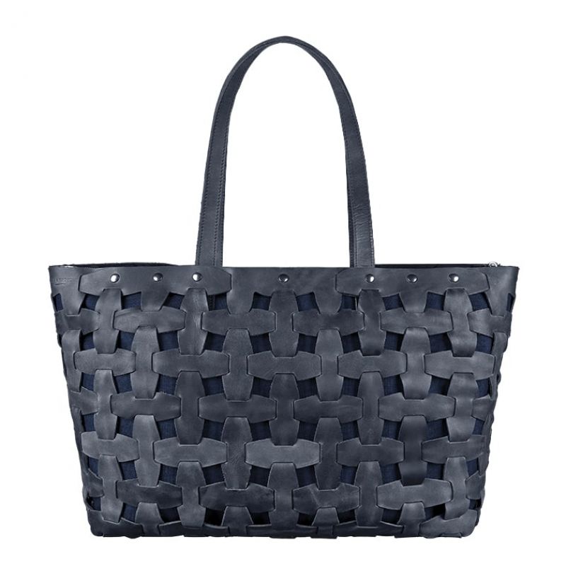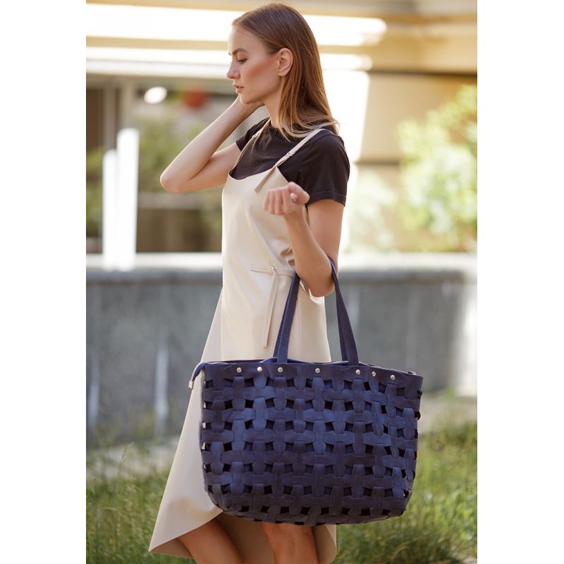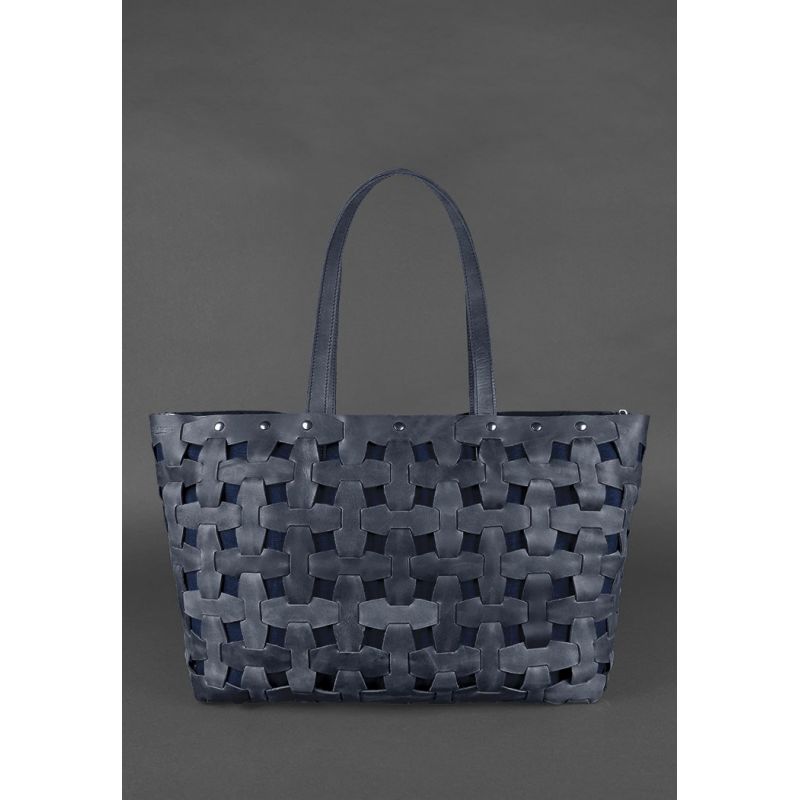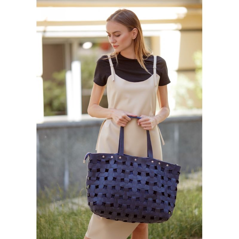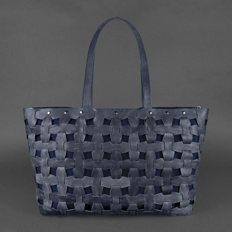 Кожаная плетеная сумка в темно-синем цвете определенно понравиться любительницам стильных и оригинальных вещей. Выполнена сумка-шоппер из натуральной кожи Crazy Horse в цвете ночное небо. Полоски кожи соединяются по принципу пазлов, формируя красивое плетение внешнего каркаса сумки.