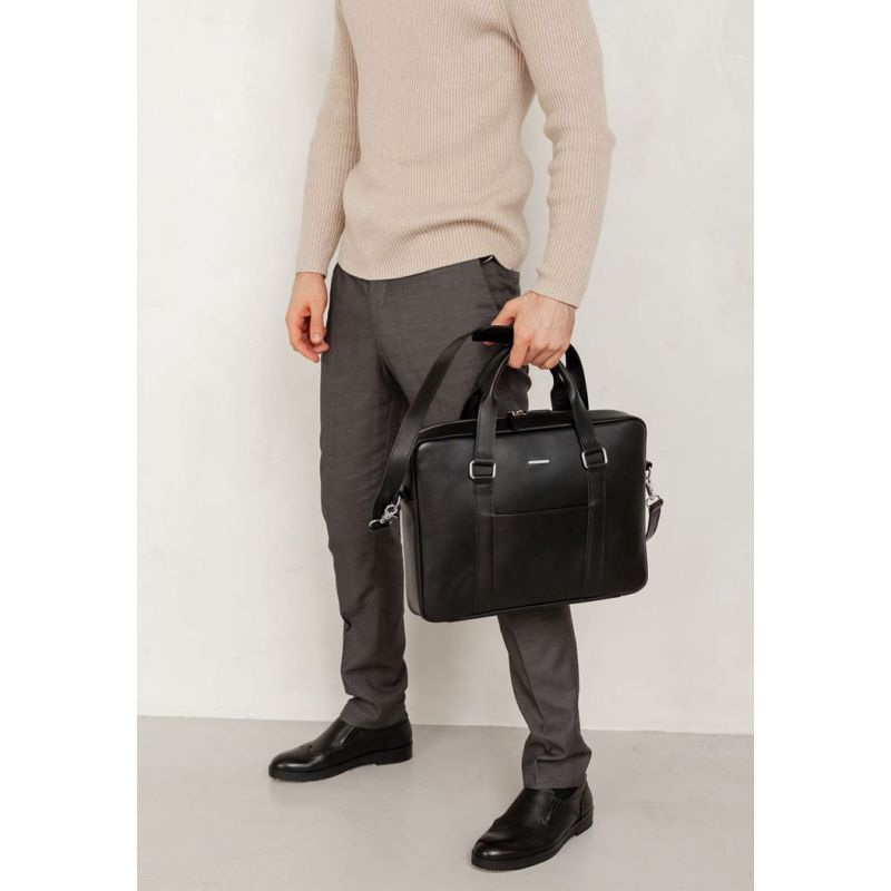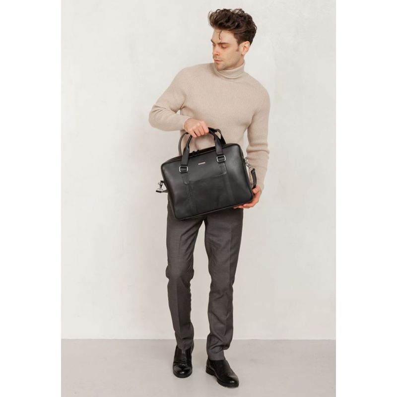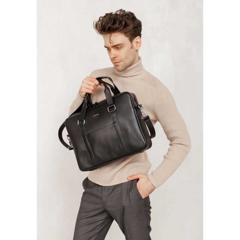 Кожаная сумка для ноутбука и документов черная BlankNote (BN-BAG-37-g) идеально подойдет для деловых и активных людей. В специальном кармане, который закрывается на кнопку, можно поместить ноутбук. Основное отделение деловой сумки для документов закрывается на молнию. Также имеется два внутренних кармана для мелочей и один небольшой карман на внешней стороне черной кожаной сумки.