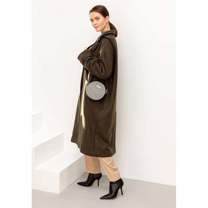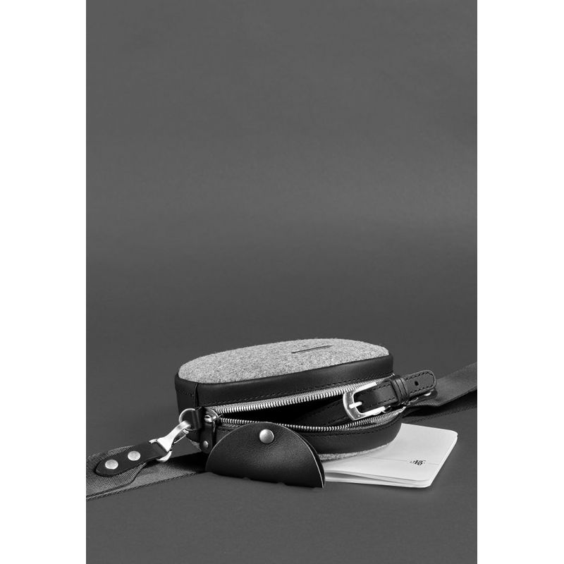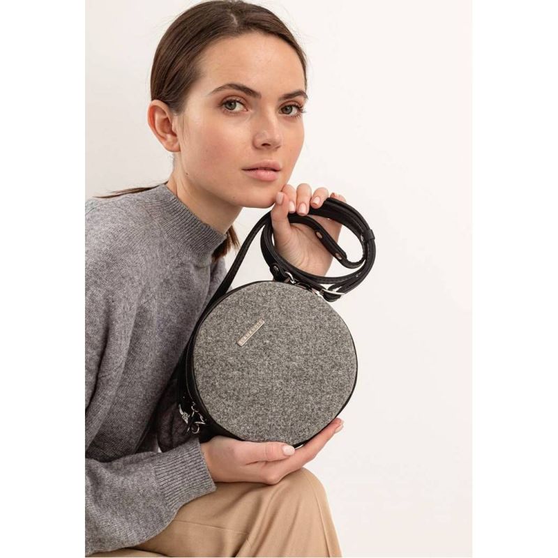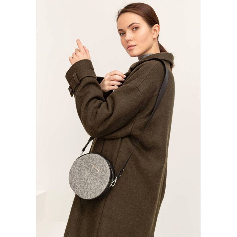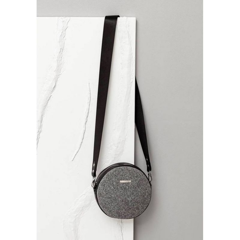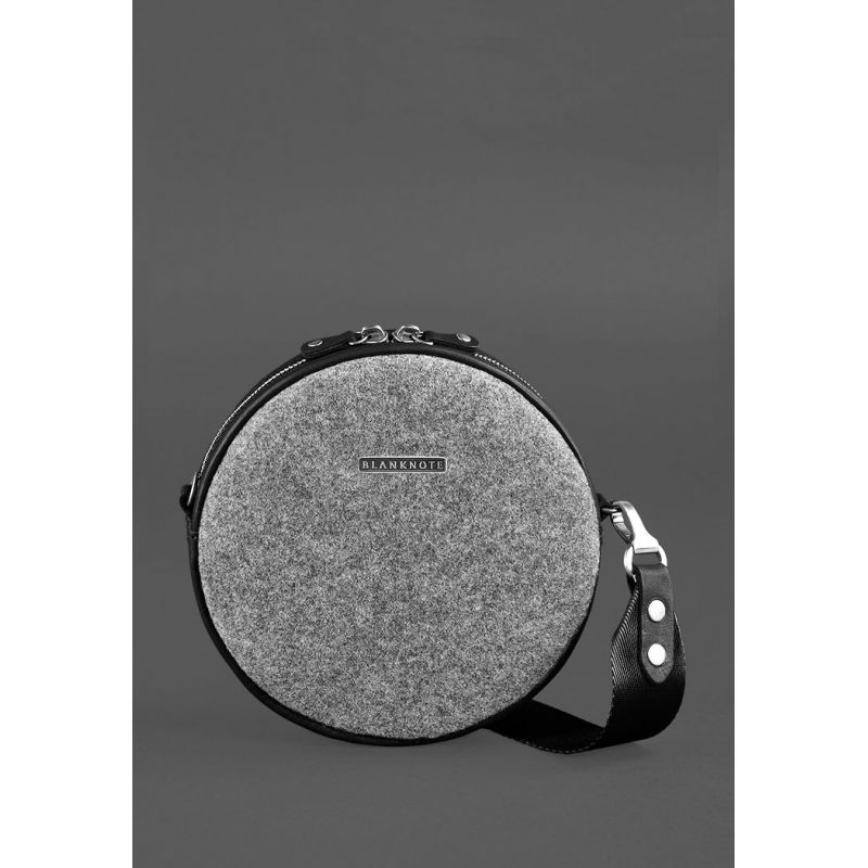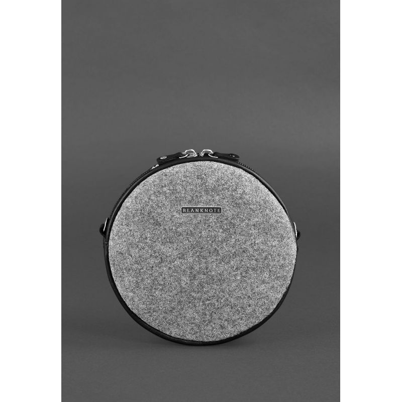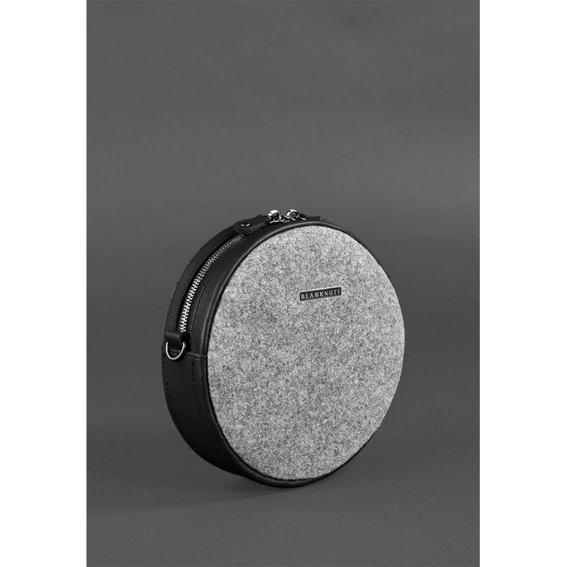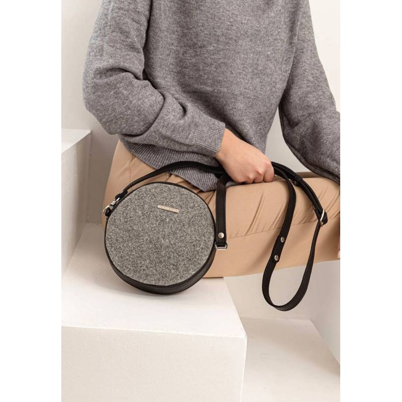 Круглая фетровая женская сумка Таблетка с кожаными черными вставками