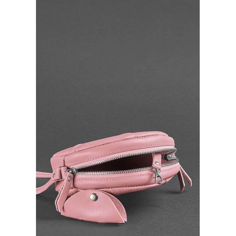 Длину плечевого ремешка можно регулировать. Пошит аксессуар вручную из натуральной кожи краст в очень нежном розовом цвете.