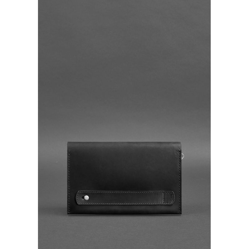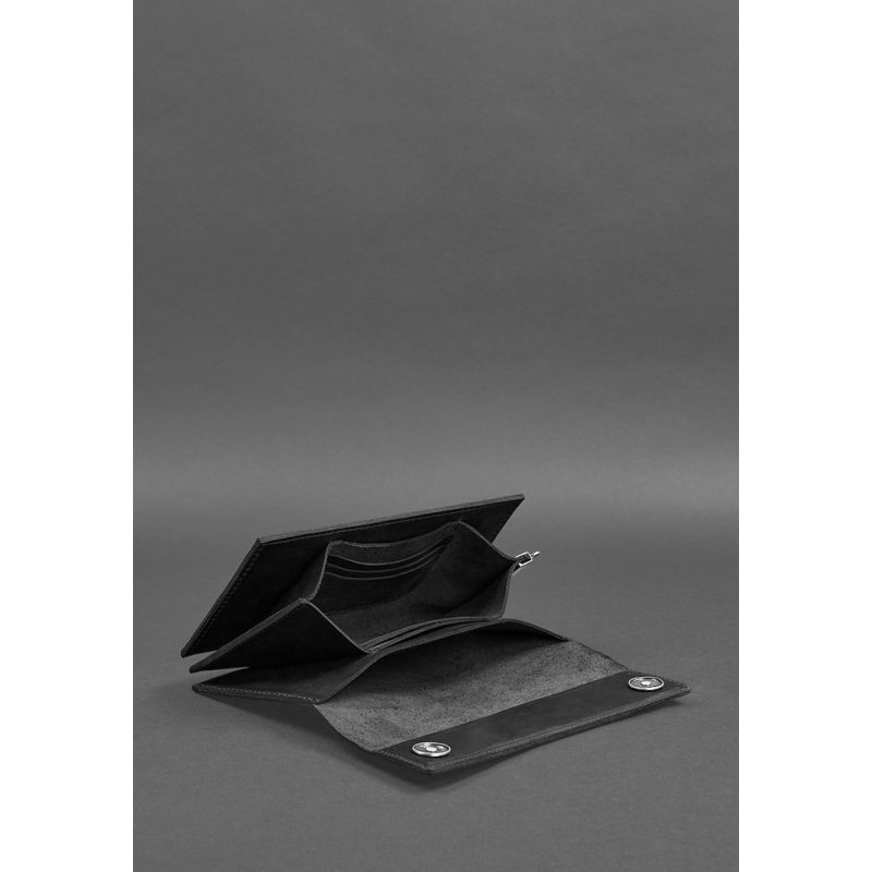 Изготовлено портмоне полностью вручную из очень прочной натуральной кожи Crazy Horse в черном цвете. Закрывается аксессуар клапаном на кнопки. Под клапаном имеется дополнительный карман на молнии.