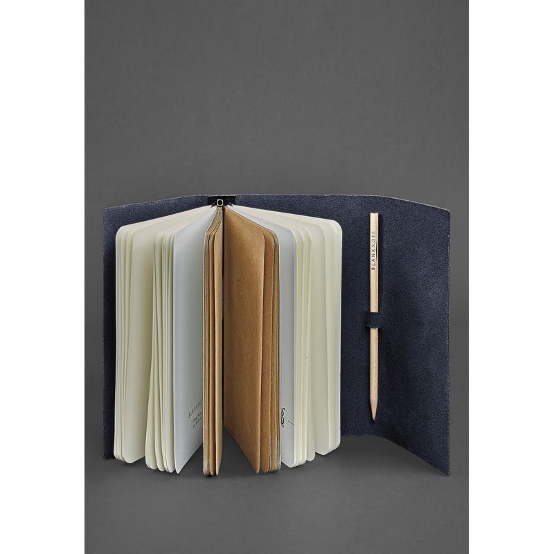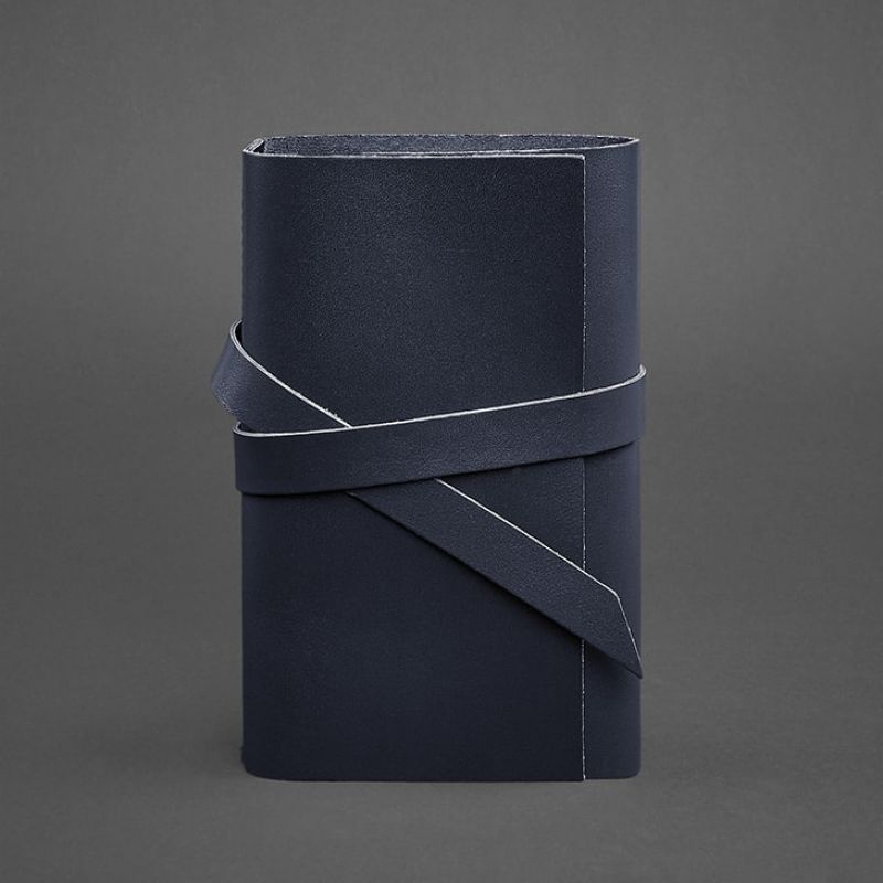 Обложка софт-бука выполнена из цельного куска натуральной кожи в темно-синем цвете. Внутри блокнота 3 сменные тетради по 40 листов. Вы можете дополнительно подобрать нужный цвет страниц и линовку.
