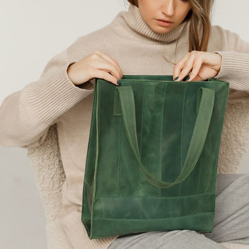 Такая винтажная сумка-шоппер отлично впишется в повседневный и деловой образ. Глубокий зеленый цвет аксессуара смотрится свежо и интересно. Зелёная сумка отлично сочетается с бежевым и серым цветом. Она добавит образу нового звучания и станет ярким акцентом повседневного лука.