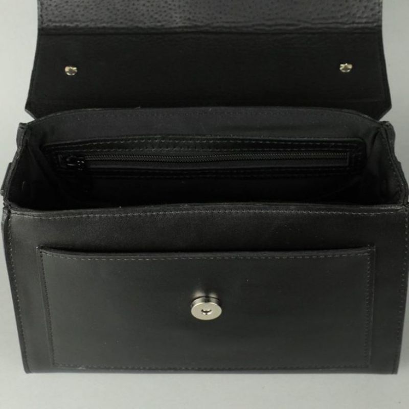 Размер : 26(23)х20х12(6) см Материал : кожа, подкладка из плотной ткани Внутри : одно отделение, три больших кармана и карман на молнии Снаружи : один карман на молнии, один карман без молнии, ручка Фурнитура : металлическая Шлейка : длинная шлейка 3х140 см для носки через плечо