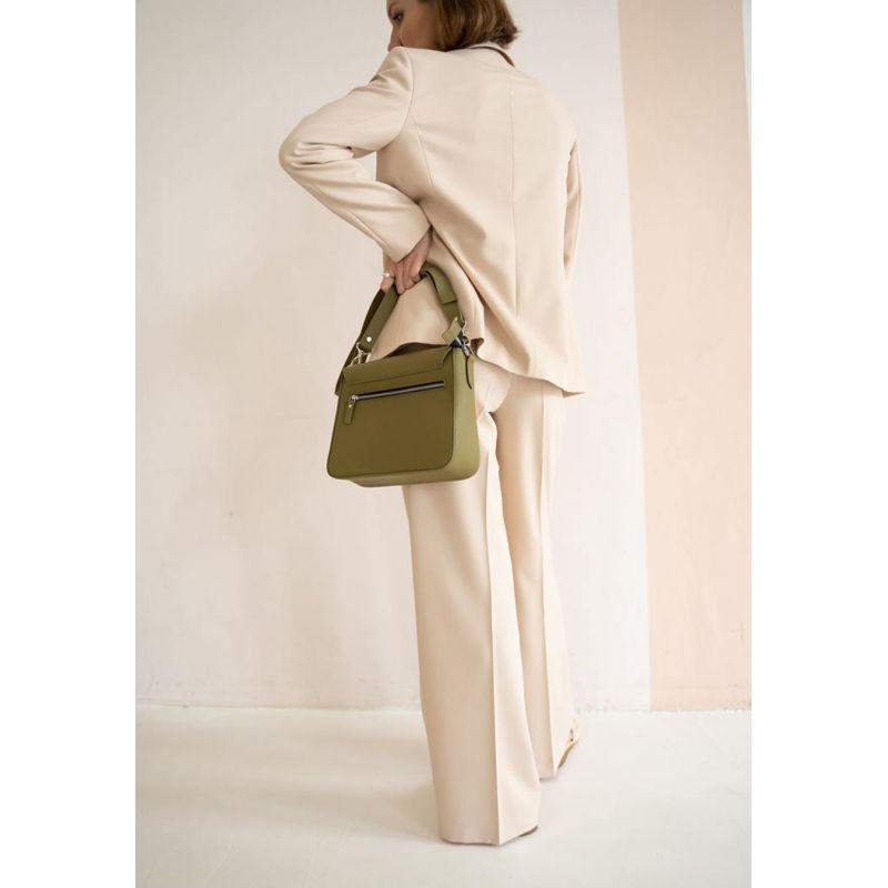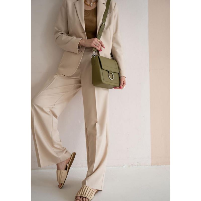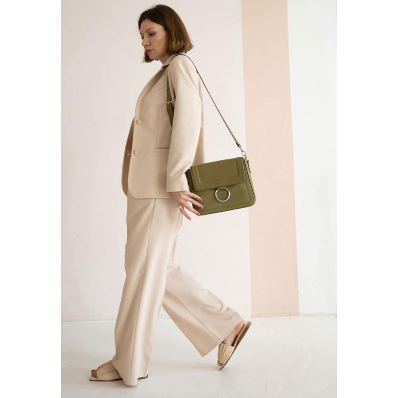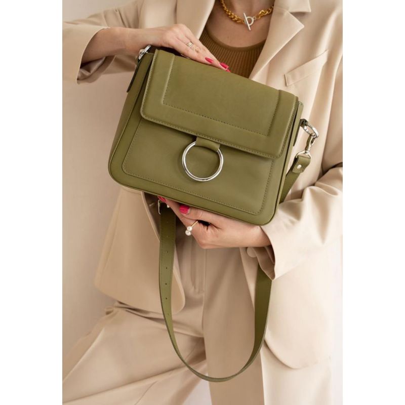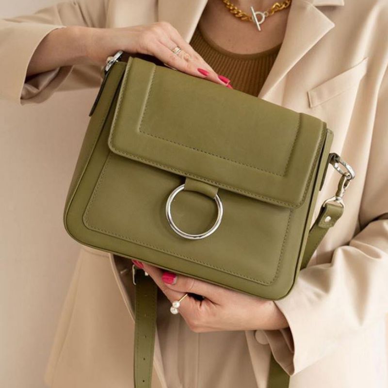 Классическая сумка с ярким акцентными кольцом, разбавляет сдержанные формы.
