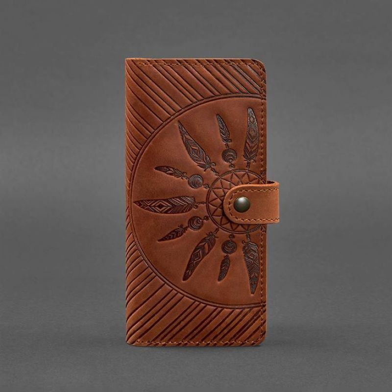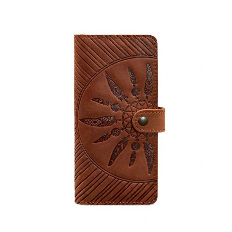 Украшен аксессуар тиснением в виде ловца снов. Мы уверены, что этот индейский талисман выполняет не только декоративную функцию, но и защищает финансы от быстрого расходования и необдуманных трат. Тиснение выполнено четко и аккуратно. Вам понравиться держать портмоне в руках!