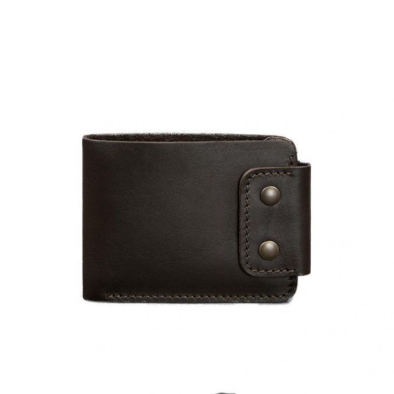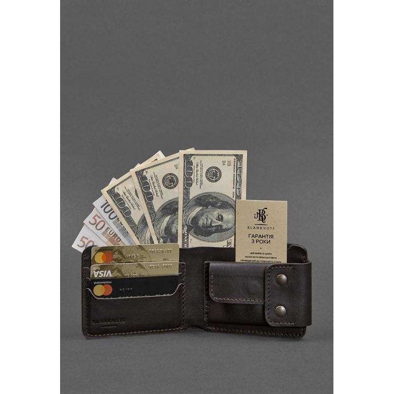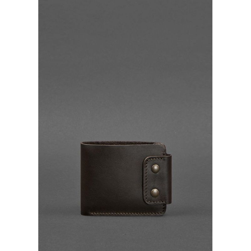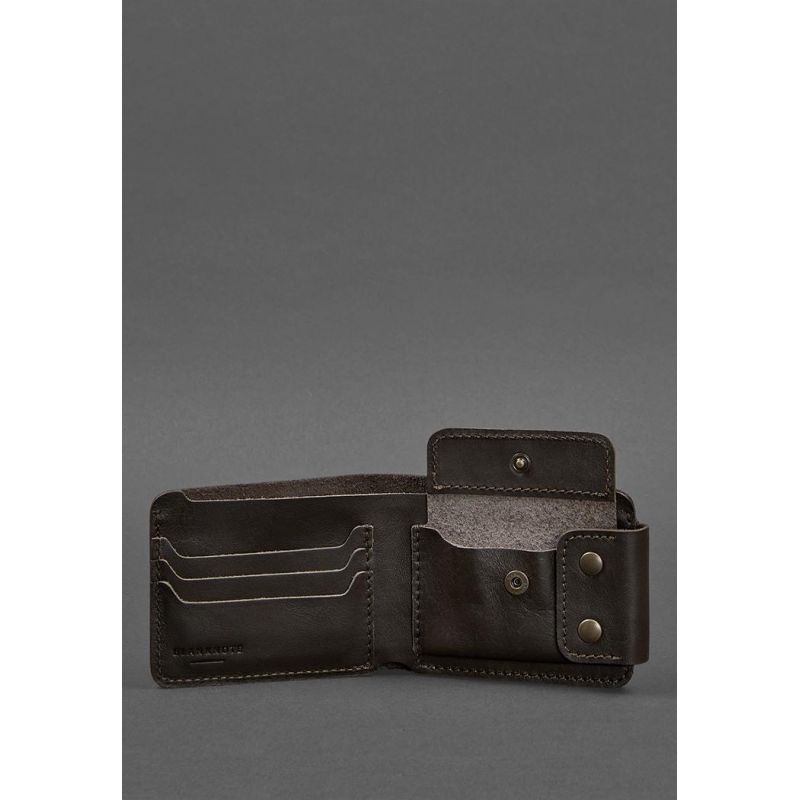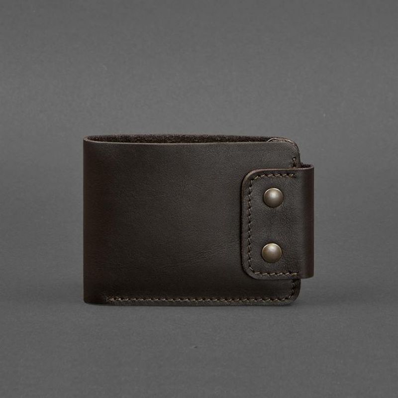 Универсальное портмоне из натуральной кожи в темно-коричневом цвете. Внутри два отделения для купюр, несколько слотов для платежных пластиковых карт и отделение на кнопке для монет и других мелочей. Портмоне имеет компактные габариты, что позволяет носить его даже в кармане брюк или пиджака.