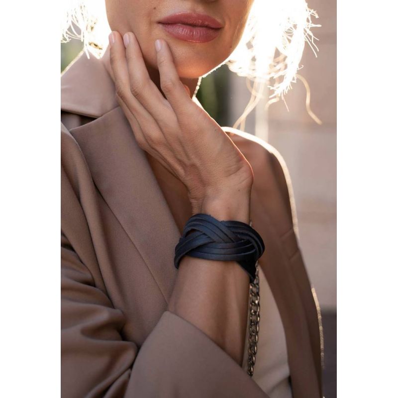 Сам браслет сделан с переплетением, стилизованным под косичку и закрывается на две кнопки.