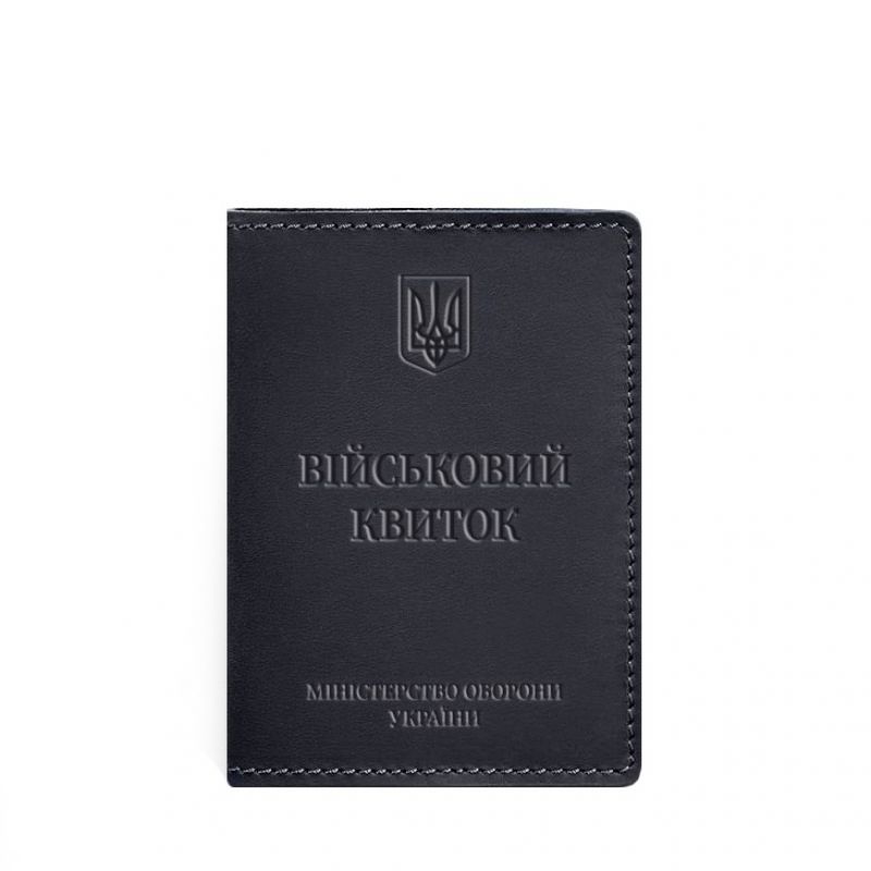 Тиснение на лицевой стороне обложки полностью дублирует оригинальный бланк документа. Вверху расположен герб Украины, посередине находится надпись «Військовий квиток» и в нижней части имеется тиснение "Міністерство оборони України"