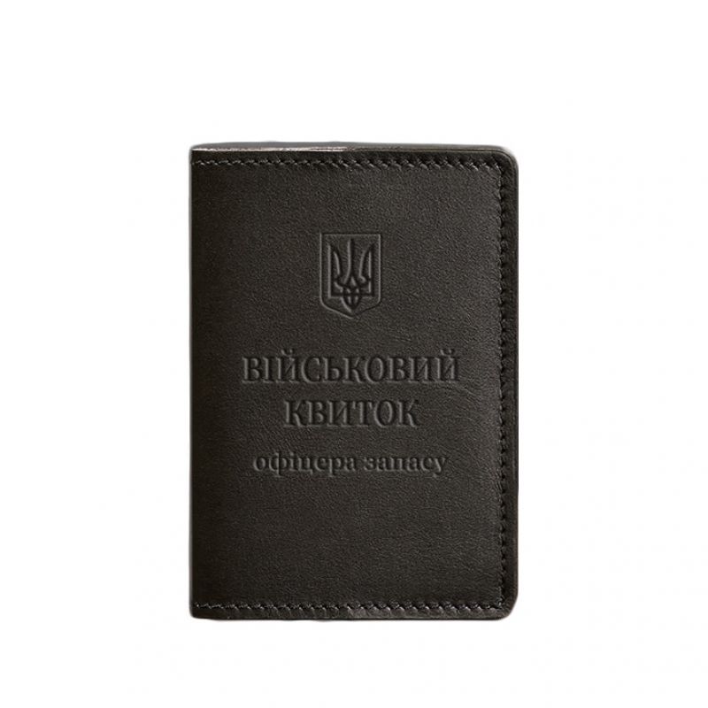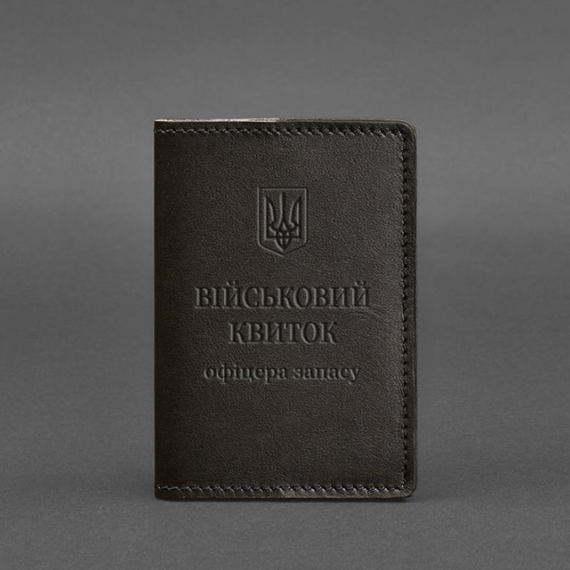 Тиснение на лицевой стороне обложки полностью дублирует оригинальный бланк документа. Вверху расположен герб Украины, посередине находится надпись «Військовий квиток офіцера запасу»