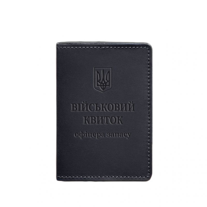Тиснение на лицевой стороне обложки полностью дублирует оригинальный бланк документа. Вверху расположен герб Украины, посередине находится надпись «Військовий квиток офіцера запасу»