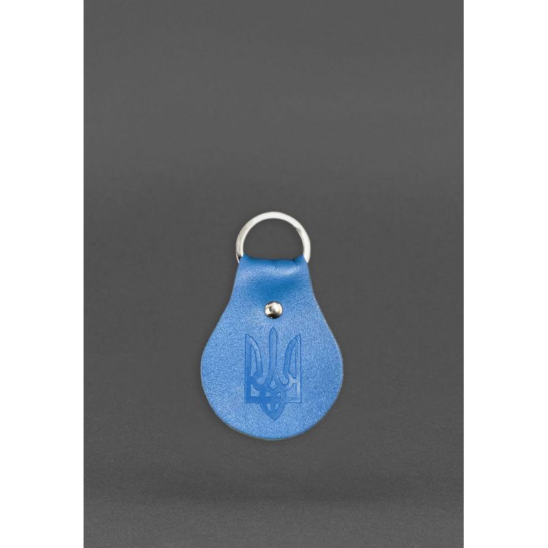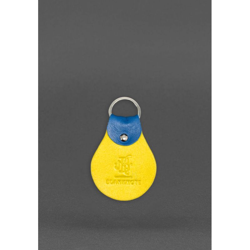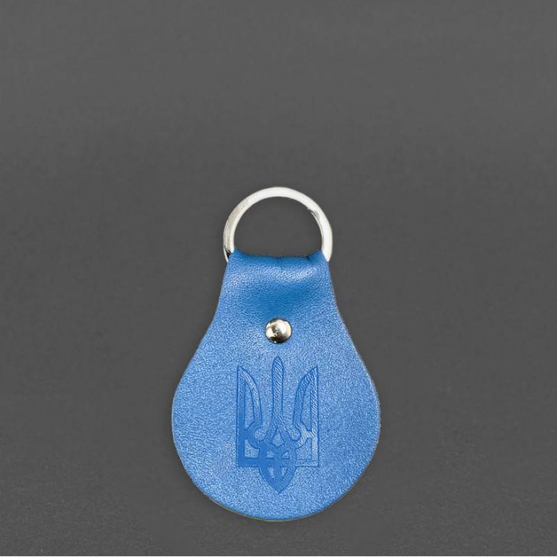 Изготовлен брелок из высококачественной натуральной кожи желтого и синего оттенков. Одна сторона брелока украшена тиснением в виде Трезубца.