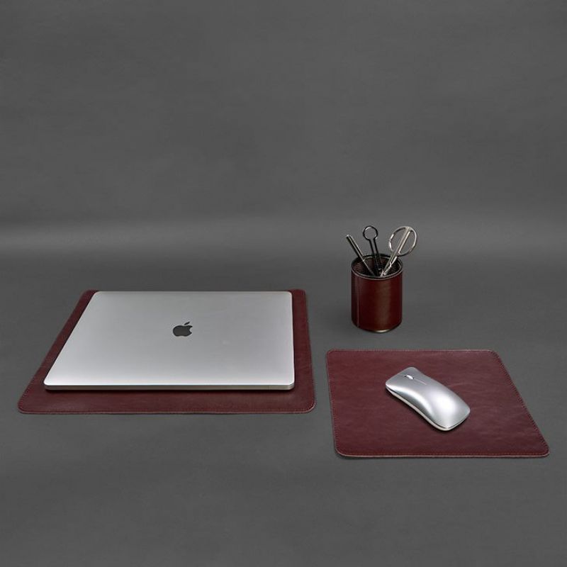 Коврик под ноутбук защитит поверхность любого стола от царапин и потертостей, которые могут появляться в процессе работы. Кожаный коврик для мышки увеличивает точность наведения курсора, улучшает скольжение и предотвращает появление царапин на нижней части корпуса устройства, а также на столе. Кожаный стакан, предназначенный для хранения карандашей, различных ручек и других канцелярских принадлежностей также будет очень кстати.