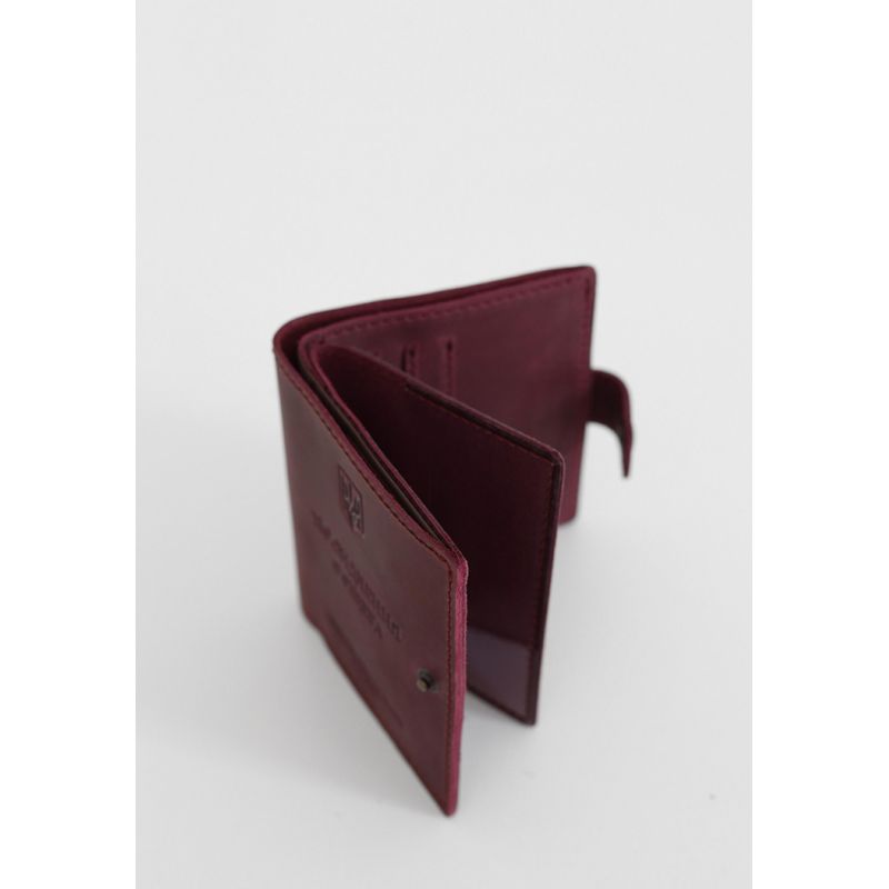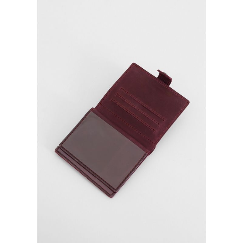 Внутри имеется 1 отделение для купюр, 3 слота для пластиковых карт, прозрачный карман и отделение для документа. Закрывается портмоне-обложка хлястиком с кнопкой.