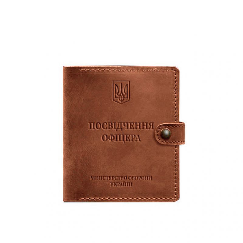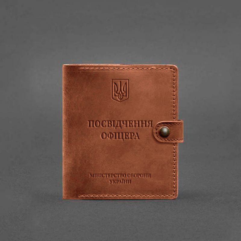 Кожаная обложка-портмоне на удостоверение офицера от бренда БланкНот специально разработана для бережного хранения вашего документа. Сшита из высококачественной натуральной кожи crazy horse, с винтажной матовой поверхностью. Кожа crazy horse обладает винтажным эффектом, она достаточно крепкая и долговечная. Тиснение на лицевой стороне обложки полностью дублирует оригинальный бланк документа. Вверху расположен герб Украины, посередине находится надпись «Посвідчення офіцера» и в нижней части имеется тиснение «Міністерство оборони України» Внутри имеется 1 отделение для купюр, 3 слота для пластиковых карт, прозрачный карман и отделение для документа. Закрывается портмоне-обложка хлястиком с кнопкой.   Почему стоит купить Коричневую кожаную обложку-портмоне на удостоверение офицера (BN-OP-11-k-kr) от BlankNote? Качественная натуральная кожа Четкое и хорошее тиснение Ручная работы Гарантия 3 года Наши мастера могут изготовить обложку-портмоне в любом другом цвете. Также изделие можно персонализировать. Обратите внимание на наши изделия с украинской символикой. Рекомендуем обложки для паспорта с гербом Украины. Гарантия на обложку-портмоне - 3 года с момента покупки. ВНИМАНИЕ! Выделка данной кожи предполагает естественное появление на ней царапин и потертостей в ходе использования! От этого изделие становится более индивидуальным и приятным, это оценят настоящие поклонники винтажного стиля:)  А так же первое время кожа может краситься при сильном трении об другие предметы  - это особенность её выделки, постепенно этот эффект уменьшается,  кожа полируется и приобретает чуть глянцевый эффект. Фурнитура и комплектация может быть изменена производителем