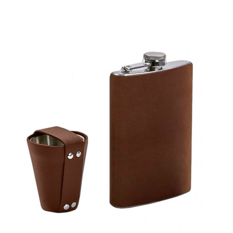 Набор с флягой и рюмками в кожаном чехле светло-коричневый Crazy Horse  – (BN-FL-k-kr) Ищете подарок для человека, любящего активный отдых? Обратите внимание на наш набор с флягой и рюмками. Такой аксессуар будет уместен во время путешествия, туристического похода, рыбака, охоты и т.д. Его удобно брать с собой на природу, хранить в машине. Любимый согревающий алкогольный напиток всегда будет под рукой. Все элементы изготовлены из пищевой нержавеющей стали, которая не испортит вкус содержимого. Если получатель не принимает алкоголь, фляга и рюмки могут использоваться в качестве сувенира. Набор состоит из фляги обтянутой натуральной кожей и четырех рюмок в кожаном чехле. Компактная фляжка может содержать минимальное количество алкоголя для компании близких друзей. Натуральная кожа гармонично дополняет и подчеркивает солидный внешний вид фляги. Как заказать персонализированный подарочный набор? Мы можем предложить нанесение на поверхность кожи логотипа фирмы, изображений и надписи посредством гравировки или тиснения. Обратитесь к нашему менеджеру, если желаете заказать изделие с персонализацией. Подарочный набор фляга и рюмки – вариант символического подарка, который подойдет мужчинам с активным хобби и изысканным вкусом. Такой подарок будет напоминать о человеке и радовать функциональностью в повседневном использовании. Фурнитура и комплектация может быть изменена производителем.