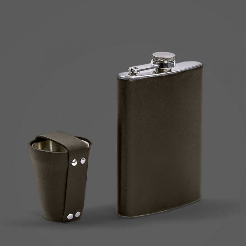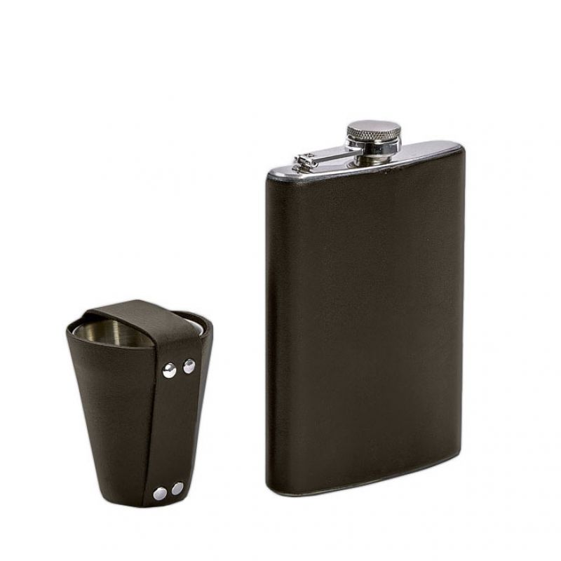 Если получатель не принимает алкоголь, фляга и рюмки могут использоваться в качестве сувенира. Набор состоит из фляги обтянутой натуральной кожей и четырех рюмок в кожаном чехле. Компактная фляжка может содержать минимальное количество алкоголя для компании близких друзей. Натуральная кожа гармонично дополняет и подчеркивает солидный внешний вид фляги.
