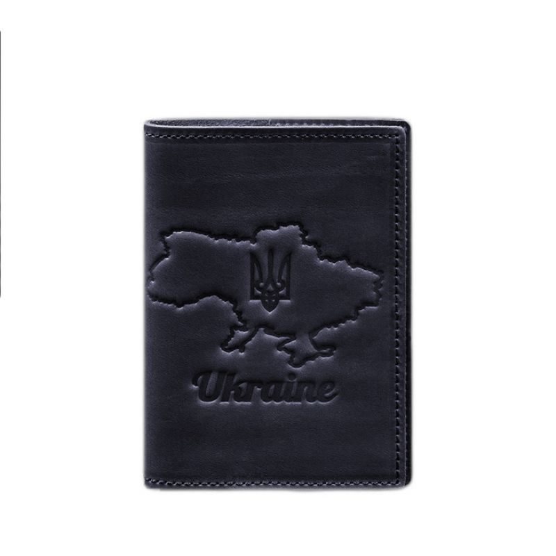 Наша новая обложка изготовлена из матовой кожи Crazy Horse. Передняя часть аксессуара украшена тиснением в виде контуров карты Украины с национальным гербом и надписью Ukraine.