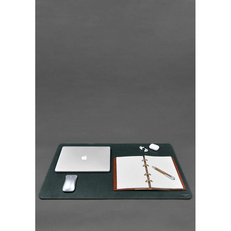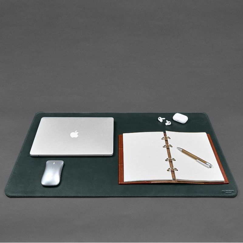 Коврик для рабочего стола 2.0 зеленый – двухсторонний. Настольный аксессуар ручной работы из натуральной кожи и фетра, который украсит рабочее место, придаст ему завершенный вид, обеспечит комфорт и порядок на рабочем столе. Одна сторона коврика изготовлена из натуральной кожи, которая имеет приятную гладкую поверхность, устойчивую к потертостям и царапинам. Вторая сторона – качественный эко-фетр, обработанный специальной пропиткой, которая предотвращает появление катышек и обладает влагостойким эффектом. Коврик для рабочего стола – отличный вариант подарка для делового человека. В нашей мастерской вы можете заказать индивидуальное изготовление подложек для стола по вашим размерам (в диапазоне до 110 на 60 см) за дополнительную плату. Стоимость уточняйте у менеджера.  Для корпоративных клиентов мы предоставляем услугу брендирования изделий. Гарантия на аксессуар - 3 года с момента покупки. Фурнитура и комплектация может быть изменена производителем