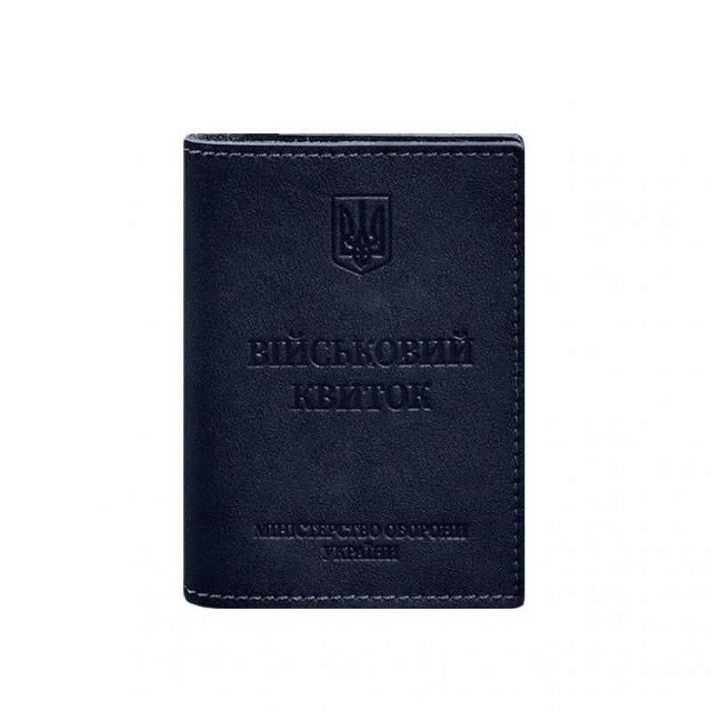 Тиснение на лицевой стороне обложки полностью дублирует оригинальный бланк документа. Вверху расположен герб Украины, посередине находится надпись «Військовий квиток» и в нижней части имеется тиснение "Міністерство оборони України"
